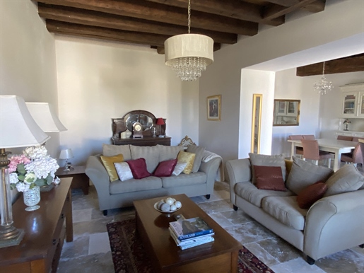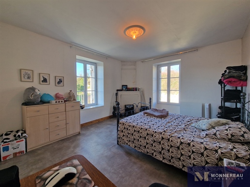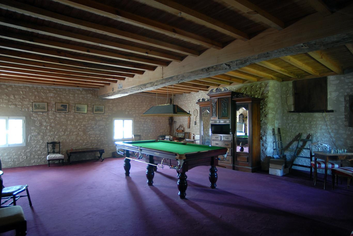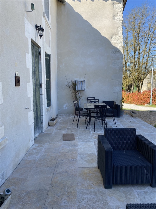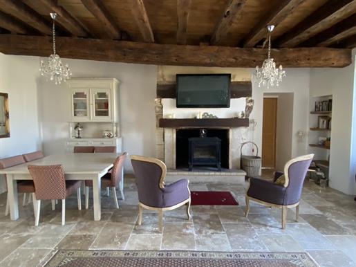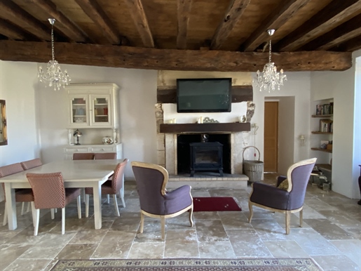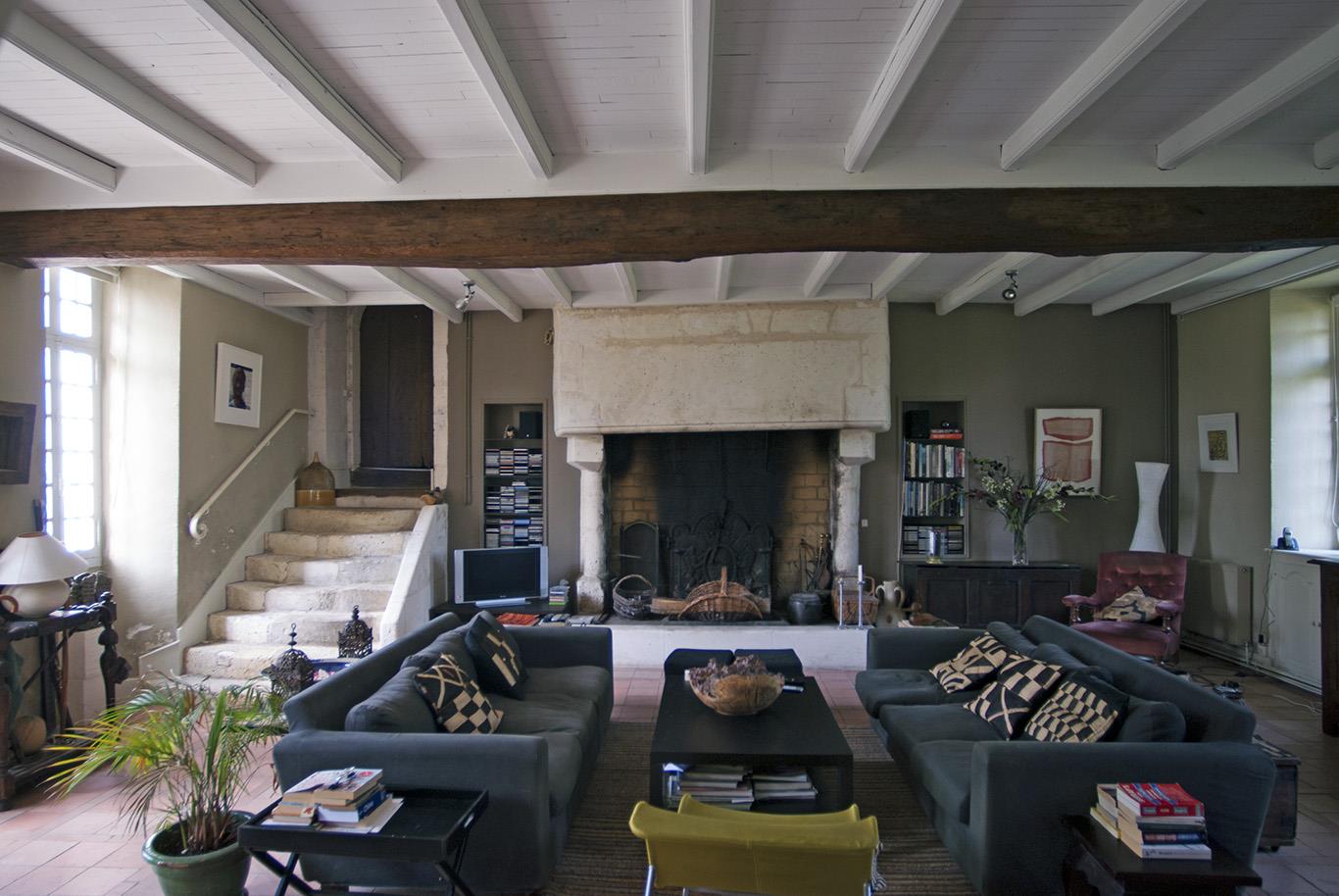 • salon spacieux de 6,8 x 7,8m avec cheminée monumentale en pierre du Xv° siècle , évier en pierre, belles terres cuites au sol et porte/fenêtre donnant sur un perron.