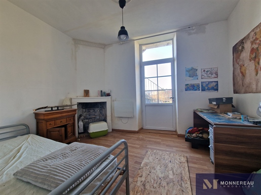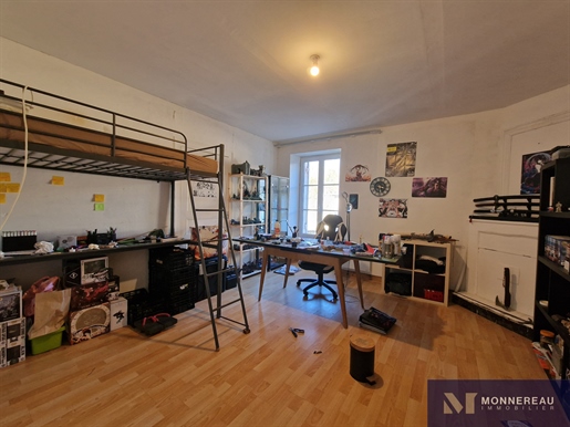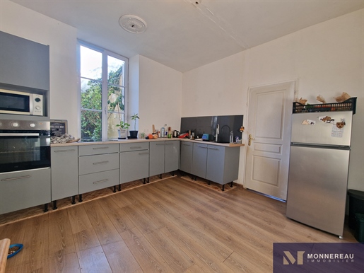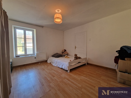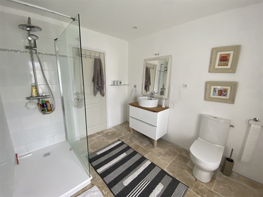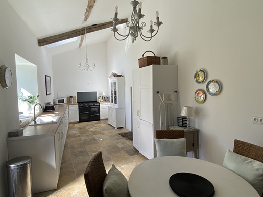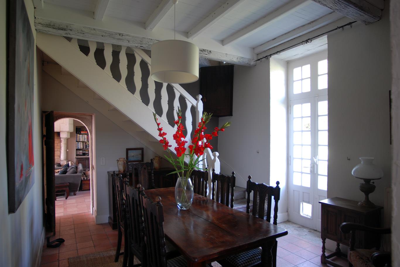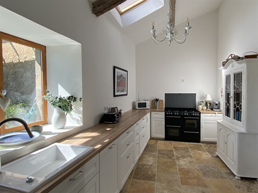 • cuisine/salle à manger de 3,7 x 7,8m avec cheminée et un bassin baptismal en pierre, placards anciens encastrés, belles terres cuites au sol et double porte/fenêtre donnant sur un perron de 1,6 x 2m avec coin déjeuner et dalles de pierre au sol