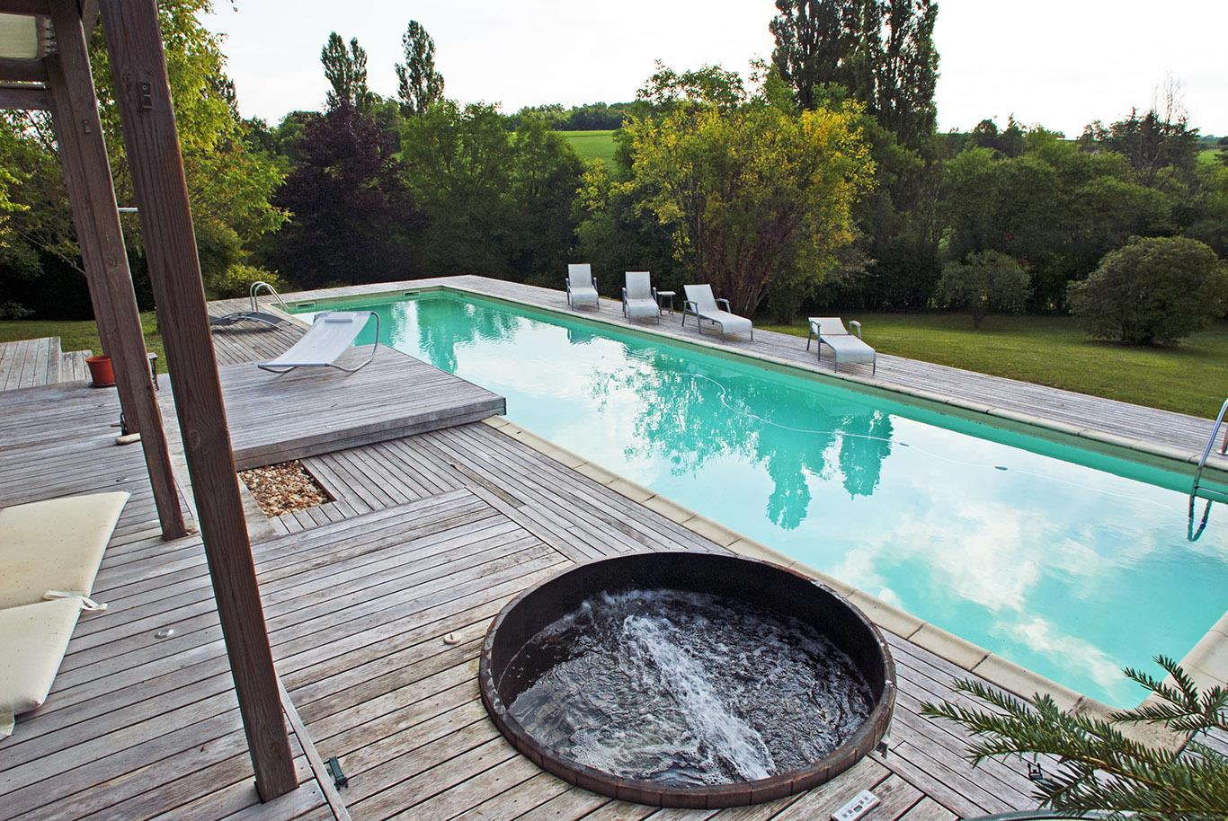 Terrain de 13 320 m2 avec jardin, belvédère en fer forgé, puits, verger avec noyers et autres arbres fruitiers, parking et une superbe espace détente avec piscine de 4,5 x 18m, grandes plages carrelées avec du travertin tout autour et le poolhouse à refaire.