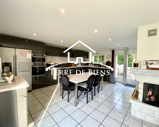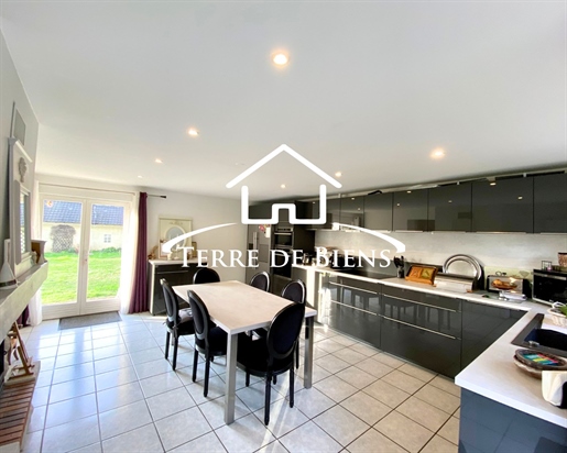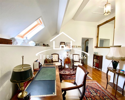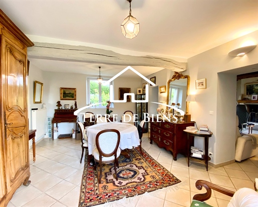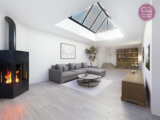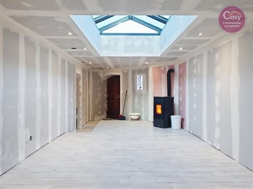 Derrière sa façade pleine d’histoire, datant d’avant 1850, se dévoile un intérieur d’environ 142 m2, lumineux et plein de possibilités. La pièce de vie, sublimée par une verrière en plafond et un poêle à granulés, ouvre sur un séjour-salle à manger de plus de 38 m2, animé par une cheminée à double foyer. En mezzanine, un espace ouvert sur la salle à manger invite à imaginer un bureau, une bibliothèque ou un coin lecture.