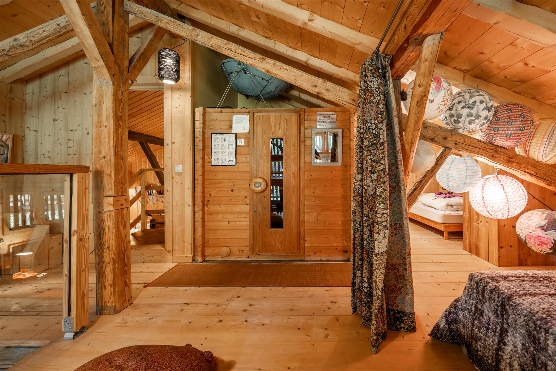 Enfin, un troisième chalet indépendant complète l’ensemble avec un espace bien-être privé comprenant sauna, jacuzzi et bain froid, ouvert sur une terrasse panoramique.