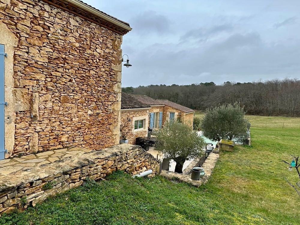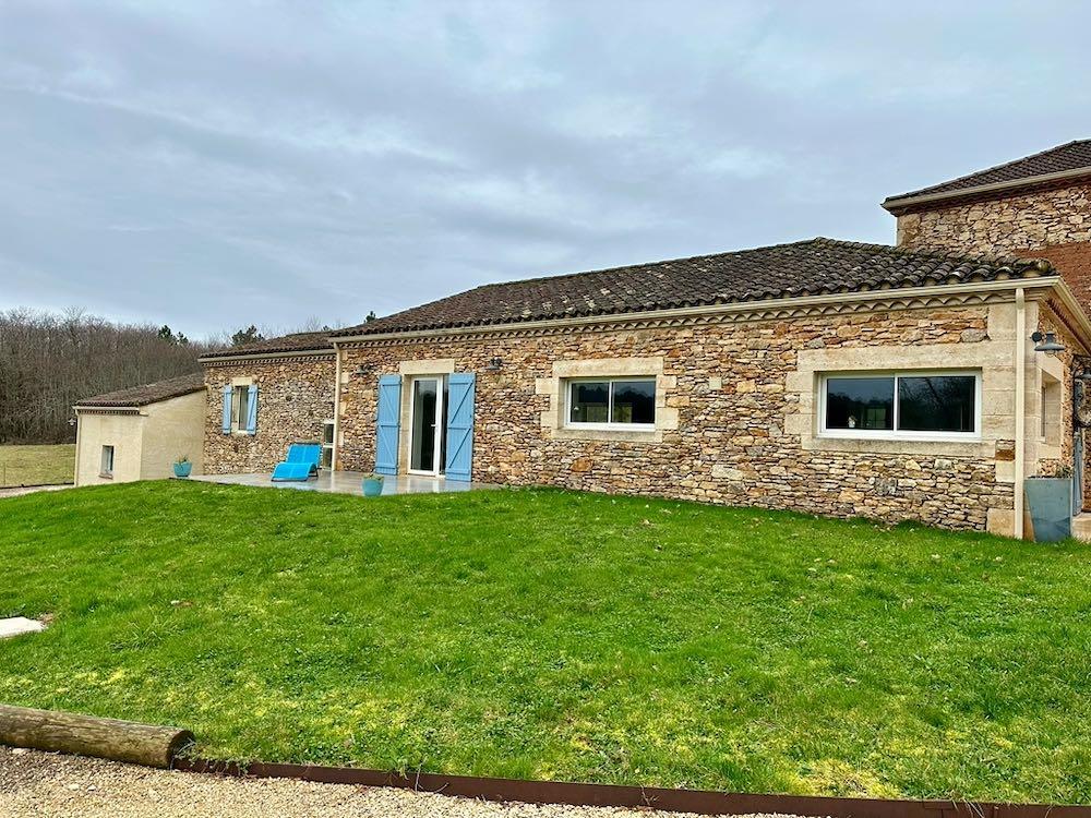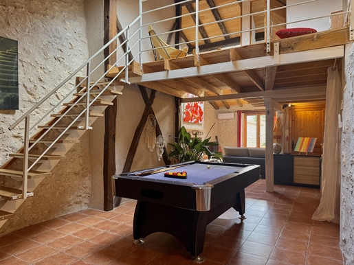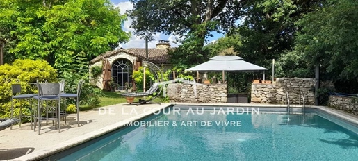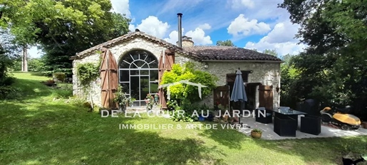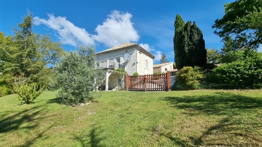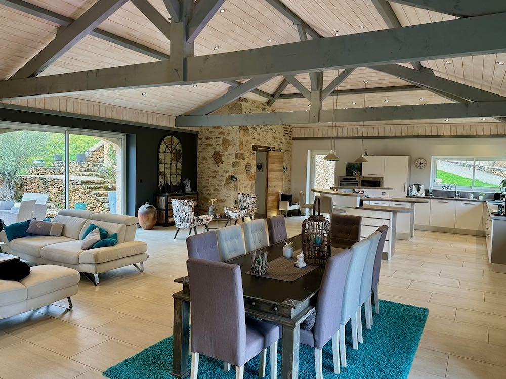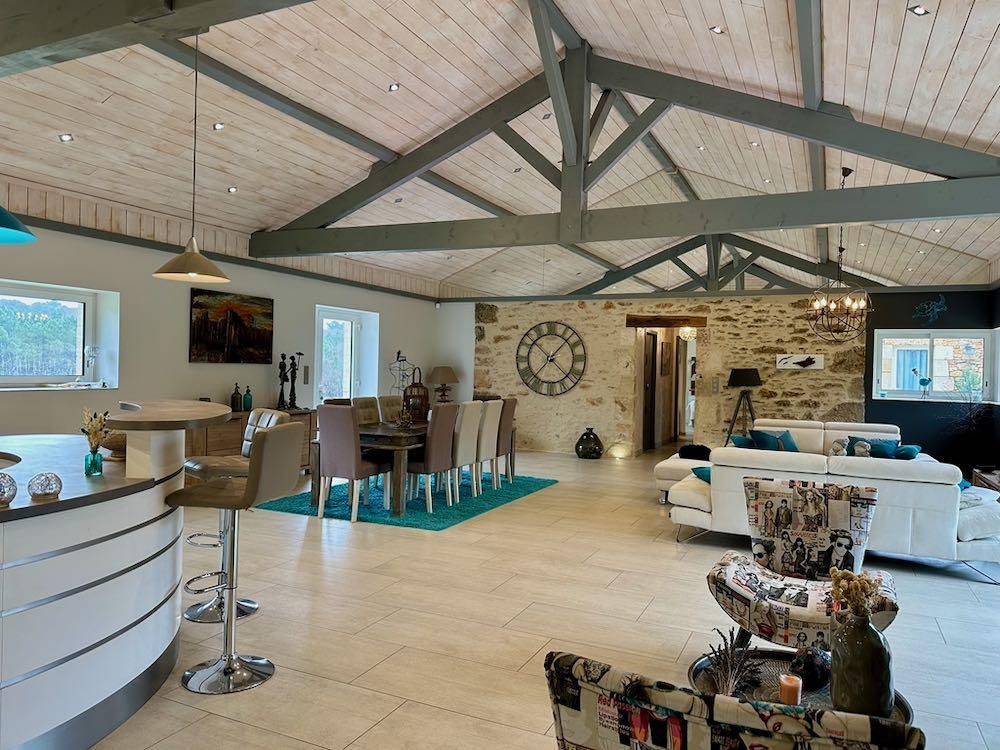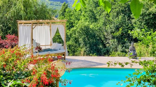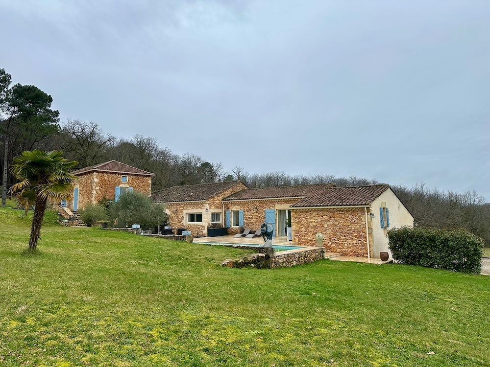Elle se compose d'une grande maison avec pigeonnier, d’une grange aménagée en deux gites, pour une surface habitable totale de plus de 370 m2. Une piscine à débordement, plusieurs terrasses, couvertes ou non et quelques dépendances bien utiles, le tout s'implante sur un parc soigné et très joliment arboré de plus de 8000 m2.