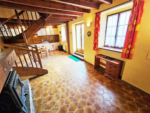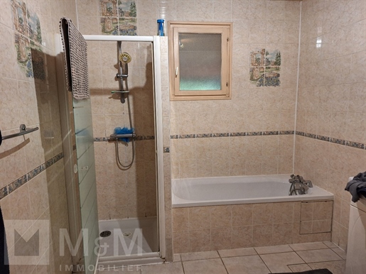 Côté extérieur, on bénéficie d'un jardinet avec une partie plate, deux terrasses exposées sud dont une attenante à la pièce de vie et surplombant le village, l'autre dotée d'un barbecue en dur, un abri bois et un rangement pour stocker vélos, skis, outils et mobilier de jardin sans oublier la possibilité de stationner un véhicule sur l'arrière du bien, autre parking très proche.