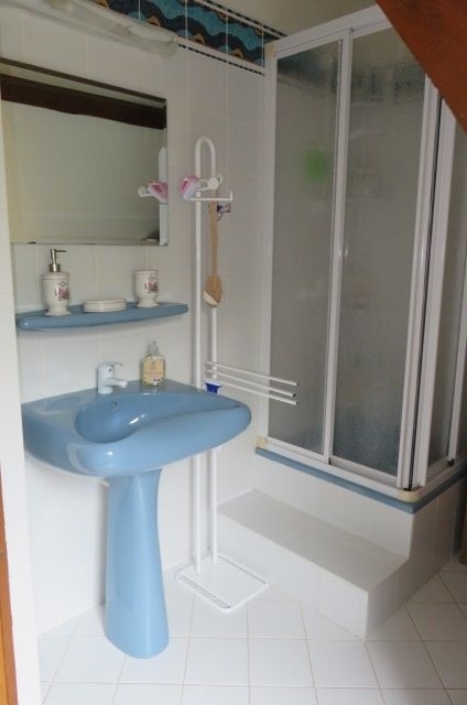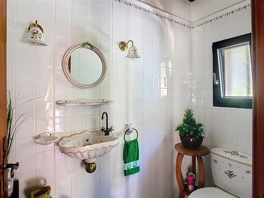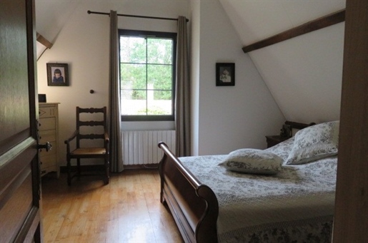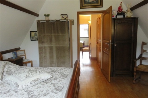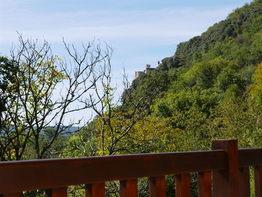 L'étage de cette partie plus récente est accessible par l'escalier en bois depuis le séjour. Un petit couloir débouche sur un couloir plus large. À gauche, une porte donne accès à la pièce de vie dotée d'une grande cheminée, située dans la partie la plus ancienne de la maison. À droite, ce couloir dessert deux chambres d'environ 11 et 17 m², des toilettes au bout du couloir, et juste avant, à gauche, une troisième chambre (environ 15,50 m²). Les deux premières chambres se trouvent à l'avant de la maison, à la hauteur du balcon. Ces deux chambres, ainsi que le balcon, offrent une vue panoramique sur les environs. La troisième chambre est située à l'arrière de la maison et donne sur le jardin par un escalier en pierre.