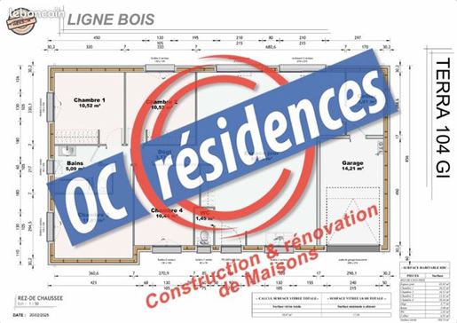 Maison à construire à Burlats (81100) Le plan Terra 104 Gi Sud offre une conception de plain-pied de 104 m², privilégiant l'espace et la luminosité. L'espace jour de 45,54 m² constitue le coeur de la maison, offrant un lieu de vie spacieux et convivial. Les quatre chambres, de tailles variées, offrent à chacun son espace d'intimité, tandis que les espaces fonctionnels, tels que le cellier, le garage et la salle de bains, facilitent le quotidien. L'espace jour, baigné de lumière naturelle, est conçu pour favoriser les moments de partage en famille ou entre amis. Les chambres, quant à elles, offrent des espaces de repos confortables et bien agencés. La chambre 3, avec ses 11,81 m², peut servir de suite parentale ou de chambre d'amis spacieuse. Les espaces fonctionnels, tels que le cellier, le garage et la salle de bains, sont pensés pour faciliter le quotidien. Le dégagement central assure une circulation fluide entre les pièces, tandis que les toilettes séparées ajoutent une touche de confort supplémentaire. L'ensemble de la maison est conçu pour offrir un espace de vie agréable et pratique, où chaque membre de la famille se sentira chez soi. Cette maison est à construire par Oc résidences, votre constructeur sur mesure du Tarn, l'Aude, l'Hérault, la Haute-Garonne ainsi que les Pyrénées Orientales. Terrain proposé par un partenaire foncier selon disponibilités et autorisation de publicité au prix de 59 000 €. Hors droit d'enregistrement et frais de notaire. Maison proposée, avec un contrat de construction de maison individuelle, dans le cadre de la loi du , au prix de 181 140 € (Hors branchements et raccordements, papiers peints, peintures, revêtement de sol dans les chambres, qui sont chiffrés dans les travaux qui restent à charge du client. Tarif modifiable sans préavis). Étiquette énergie : A. Différents modèles disponibles pour ce terrain. Assurances et garanties du constructeur comprises (Rc professionnelle, décennale, dommage ouvrage). Référence annonce : mander plus d'informations