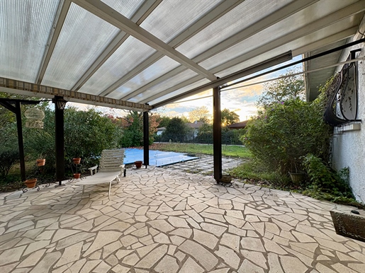 Passons enfin aux extérieurs. En sortant de la pièce de vie, nous accédons directement à une vaste terrasse en bois exotique de plus de 110 m2. Un espace repas y trouve naturellement sa place, et sur la gauche, dans son prolongement direct, se trouve la piscine, parfaitement intégrée à l’ensemble. L’Environnement est calme et pavillonnaire, idéal pour profiter pleinement des beaux jours. À l’arrière, un jardin verdoyant offre intimité et sérénité.