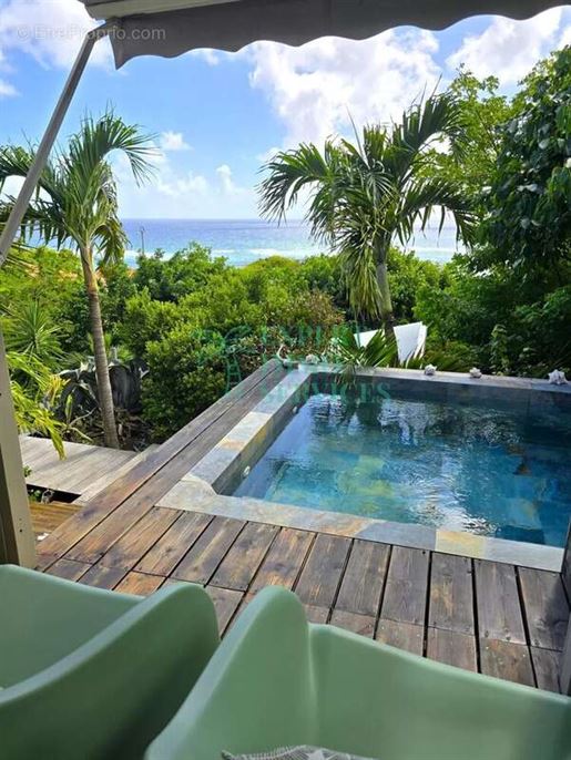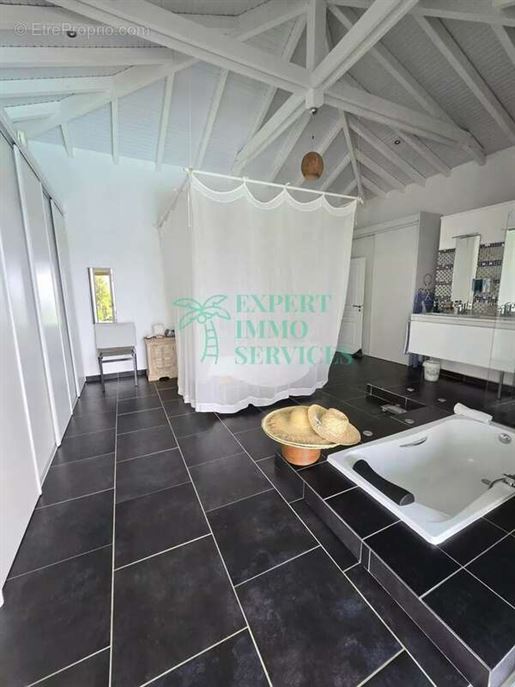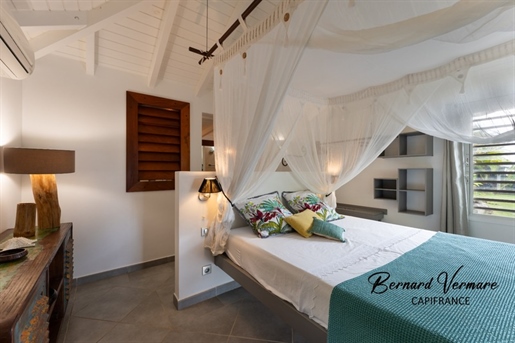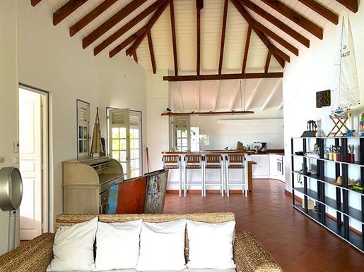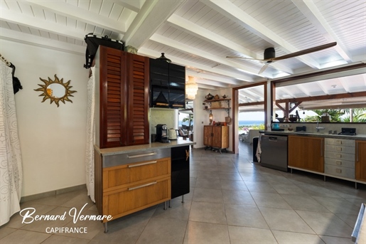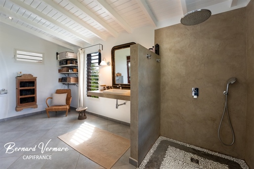 Inspirée du style Saint-Barth, la demeure de plain-pied séduit par ses volumes généreux et sa parfaite harmonie avec son environnement nature. Le séjour/salon traversant, est baigné de lumière et s'ouvre entièrement sur une terrasse spectaculaire accueillant une piscine récente à débordement. La vue mer à 180°, embrassant l'île de la Dominique jusqu'à l'archipel des Saintes, est époustouflante. Les soirées coucher de soleil et sous les étoiles y sont féériques, toujours bercées par le murmure des alizés.