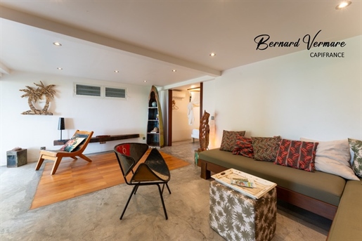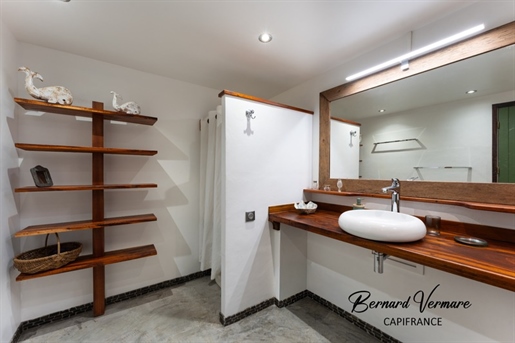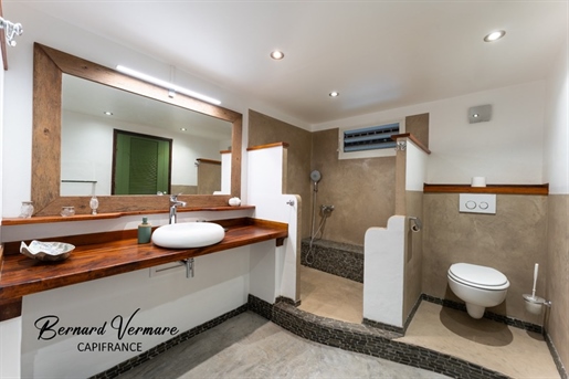 Les terrasses multiples, qui ceinturent la maison, invitent à la contemplation et à la détente. La construction, réalisée avec des matériaux de grande qualité, met à l'honneur le bois exotique, omniprésent et soigneusement entretenu. Les finitions sont remarquables, mêlant esthétisme, ingéniosité et fonctionnalité. Ici, le beau et le pratique se côtoient avec intelligence. Le charme des bois rouges sublime le contemporain des bétons cirés. Des finitions prestige, un standing rare et une élégance naturelle.