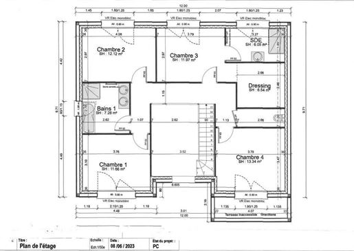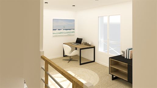 - Premier étage : un hall pouvant servir de bureau, un spacieux et lumineux salon-salle à manger et une cuisine ouverte, donnant directement sur la terrasse, deux chambres, une salle d'eau moderne avec douche à l'italienne, un Wc séparé avec lave-mains et un cellier.