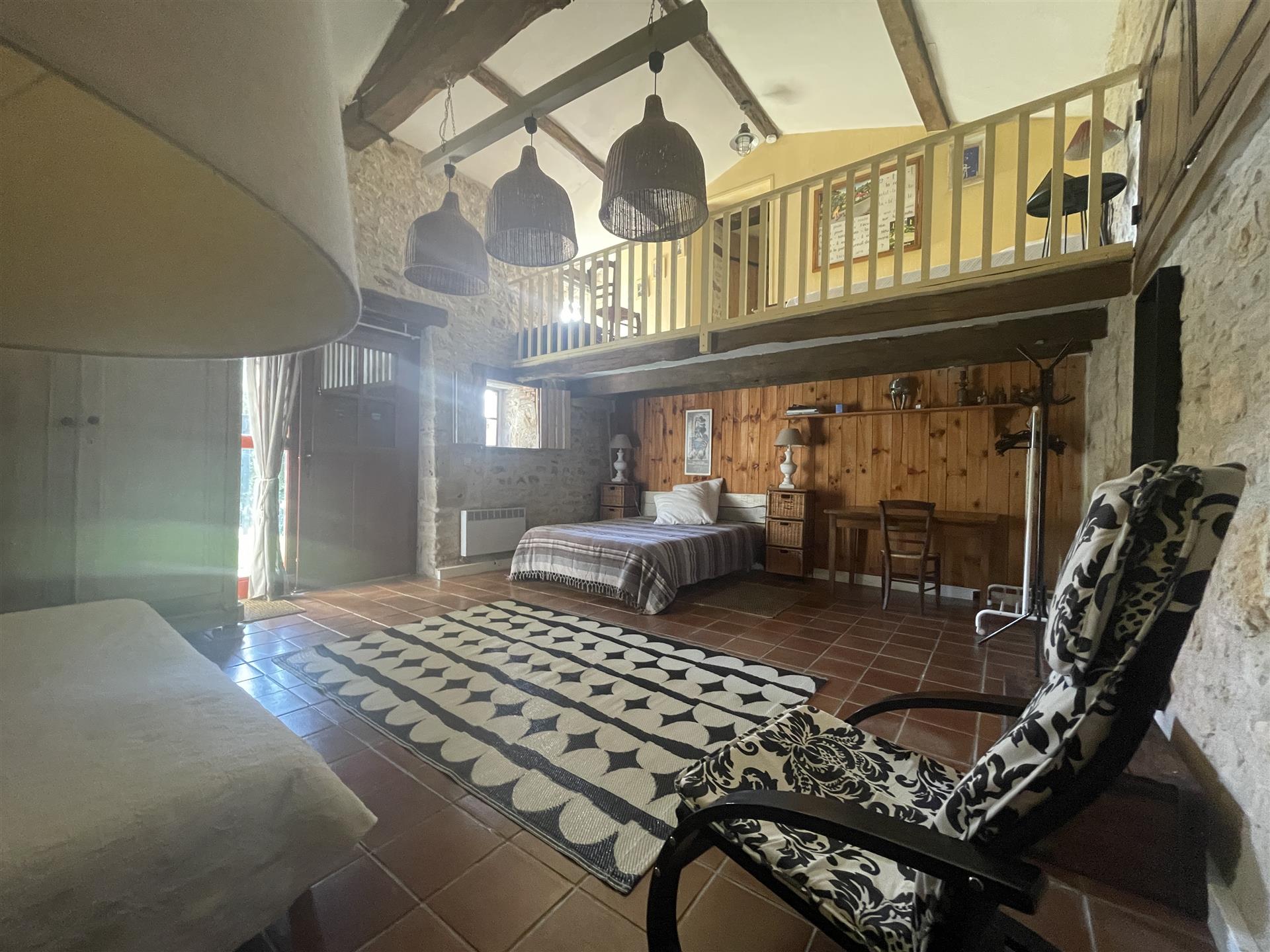 Les dépendances se composent principalement de granges à deux niveaux, actuellement utilisées comme ateliers et déjà équipées en électricité et en éclairage. Elles comprennent également deux garages, ainsi qu'un charmant bâtiment en pierre aménagé en salon de jardin, offrant une jolie vue sur le jardin et parfait pour les réceptions estivales. Ces espaces offrent un potentiel considérable pour des aménagements en gîtes, studios, espaces événementiels ou locaux professionnels.