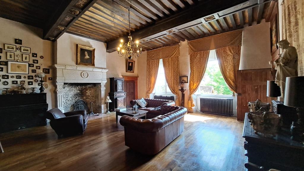 – Un grand salon de 51,55 m² avec une magnifique cheminée Renaissance en pierre. Plafond à la française dont deux poutres sont sculptées et décorées de peintures XVIIe. Parquet à l’anglaise. Deux trumeaux au motif des 4 saisons. Hauteur sous poutres : 3,79 mètres ;