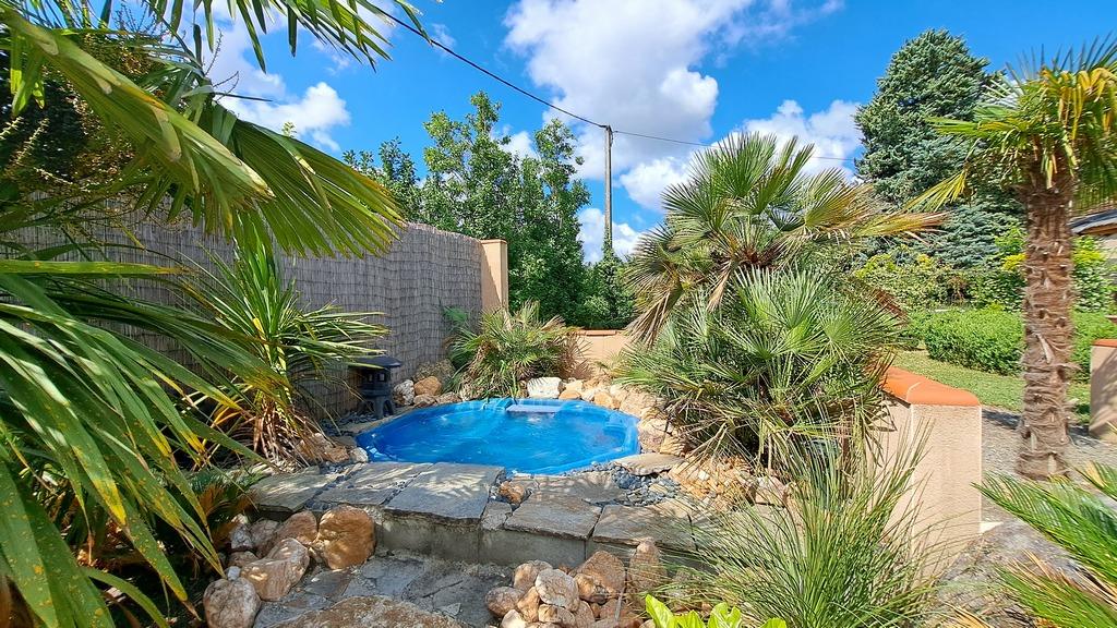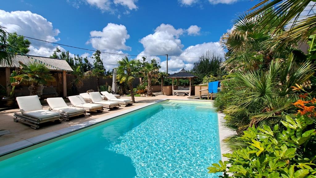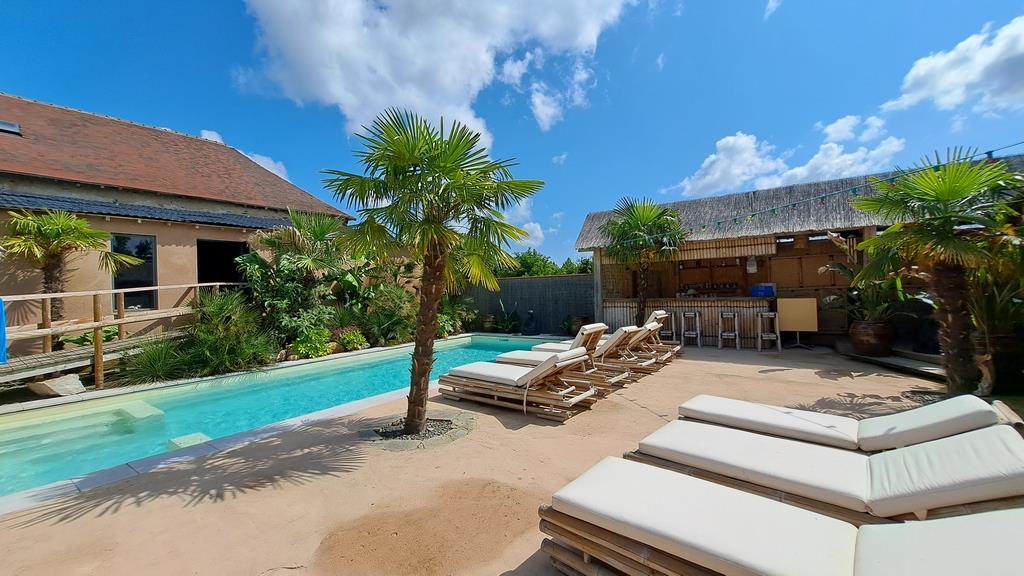Les deux salles de réception donnent plein sud sur un jardin exotique au décor balinais avec bar, piscine, jacuzzi et terrasses.
