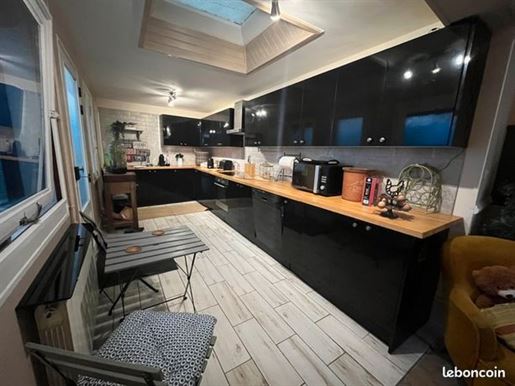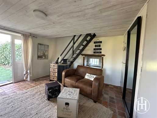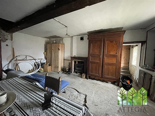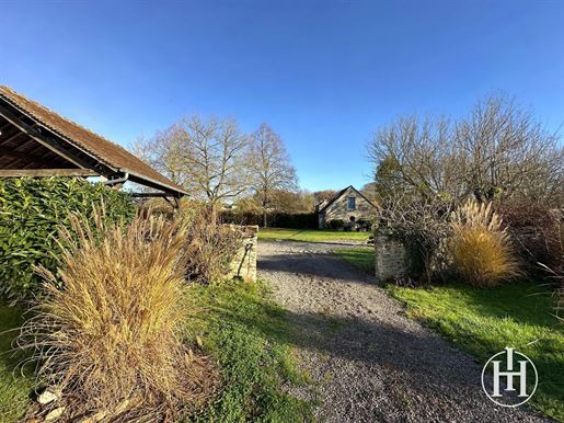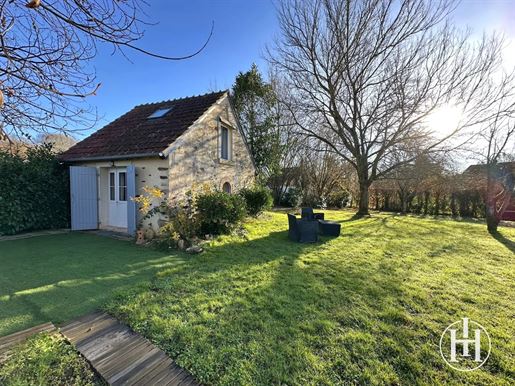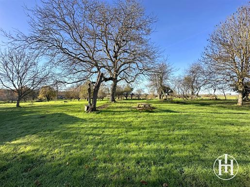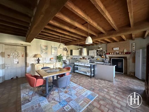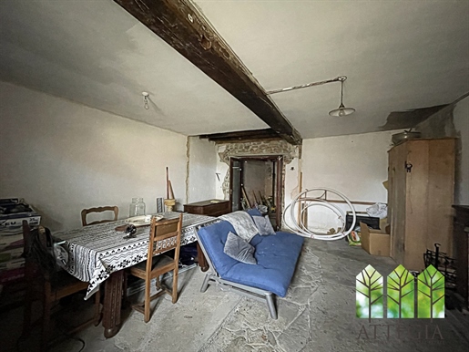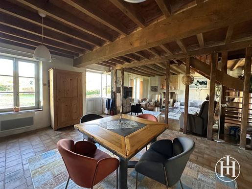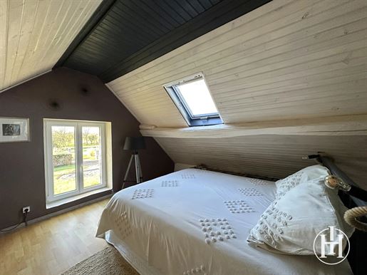 Sur la droite, un salon chaleureux de 17 m² orné de boiseries et d'une cheminée avec petit poêle, mène, via quelques marches, à une salle à manger de 14 m², puis à une cuisine de 16 m². À l'étage, deux chambres de 10 et 14 m² avec parquets anciens et cheminées, ainsi qu'une salle d'eau avec WC.