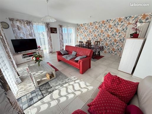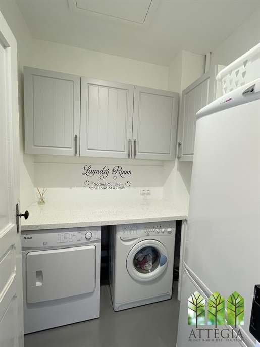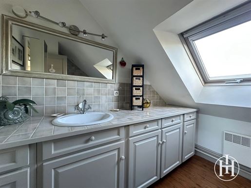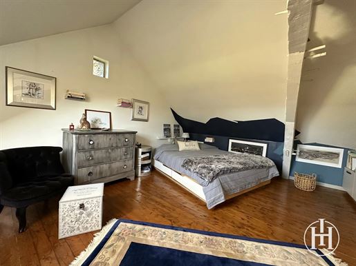 La partie gauche, accessible également depuis le couloir central, propose une salle à manger de 14 m², une cuisine aménagée de 11 m², un couloir avec coin buanderie et un Wc indépendant. À l'étage, trois belles chambres de 13, 15 et 16,5 m², une salle de bains récente de 12 m² avec baignoire et douche, ainsi qu'un grand Wc séparé.