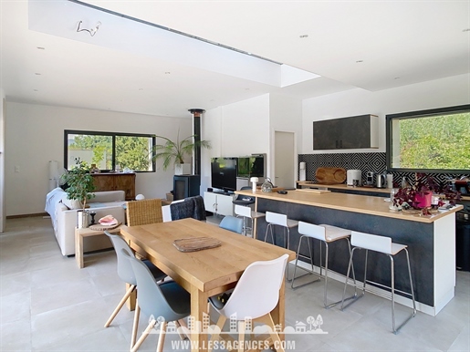 Lignes épurées, lumière omniprésente, hauteur de plafond à 7m prestations haut de gamme et finitions soignées, la pièce de vie est époustouflante et créee une harmonie parfaite entre la maison et le jardin arboré.