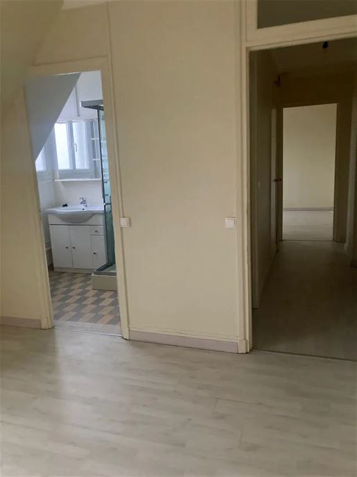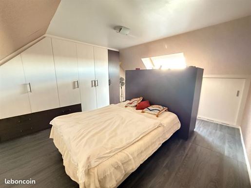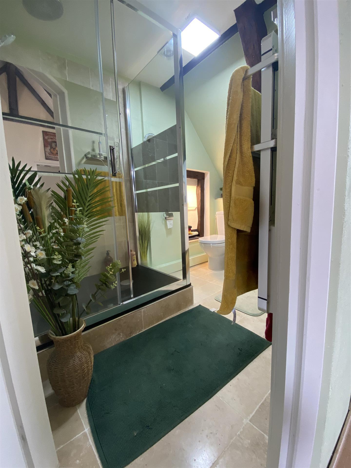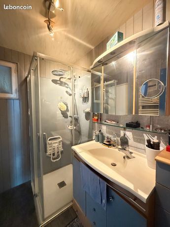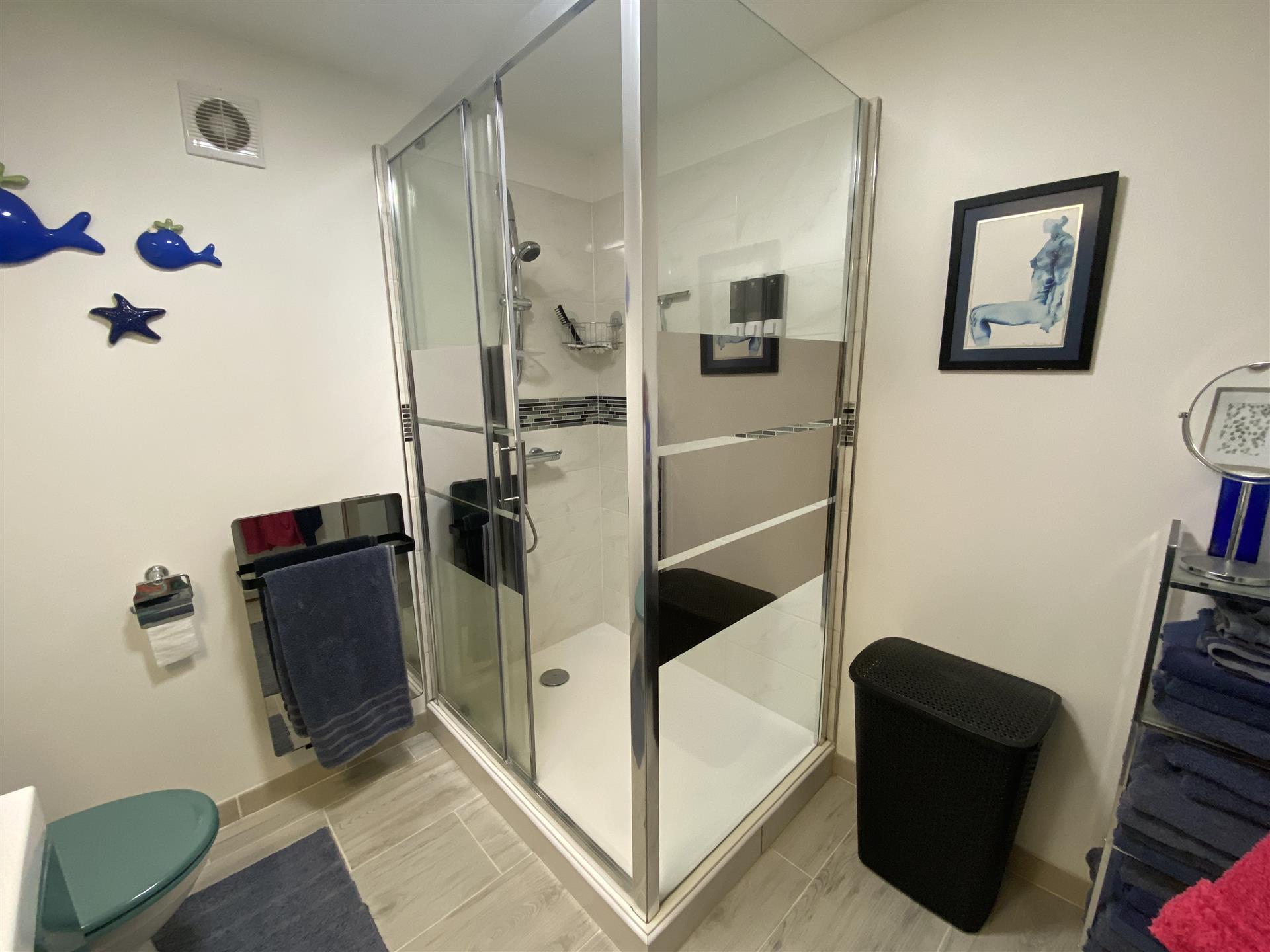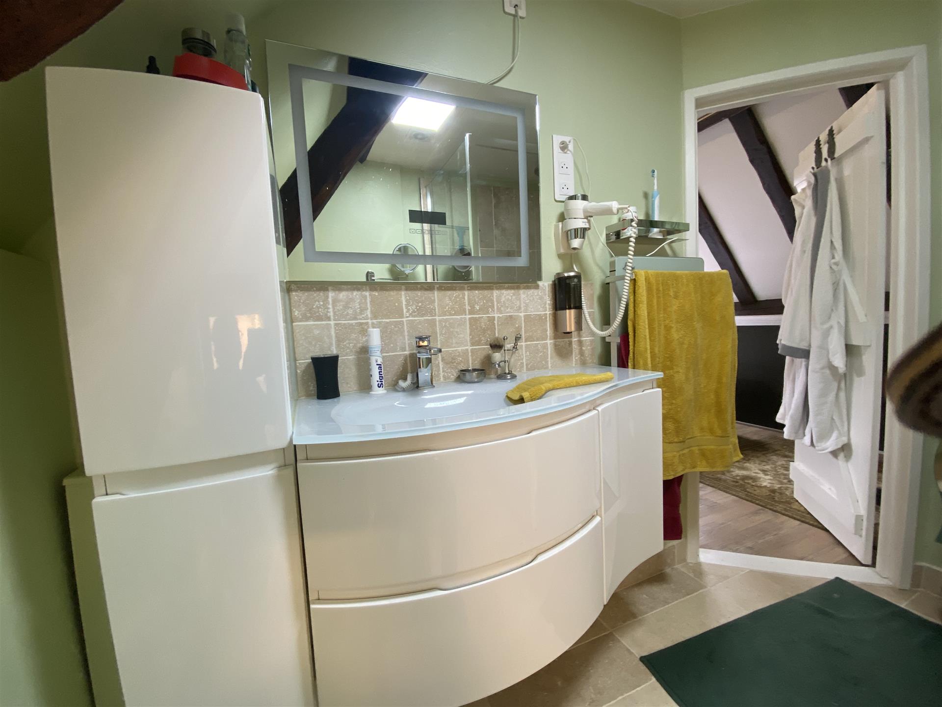 - Salle d’eau attenante à chambre 3 (2,64 m x 1,83 m) avec cabine de douches, Wc, lavabo avec meuble en dessous, niche de rangement avec lumière intégrée et un porte-serviettes, toiture mansardée.