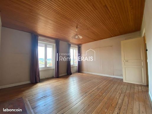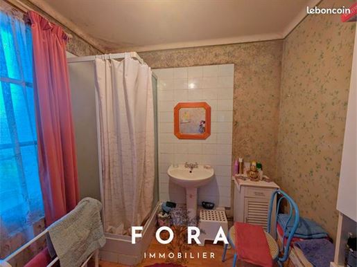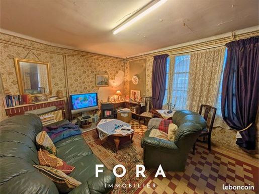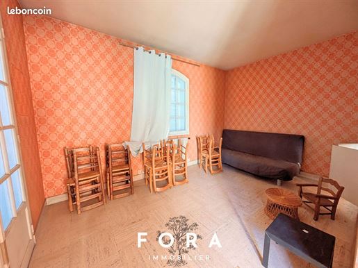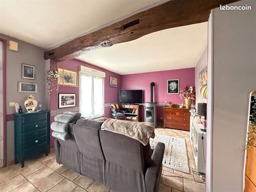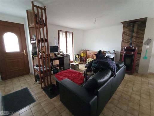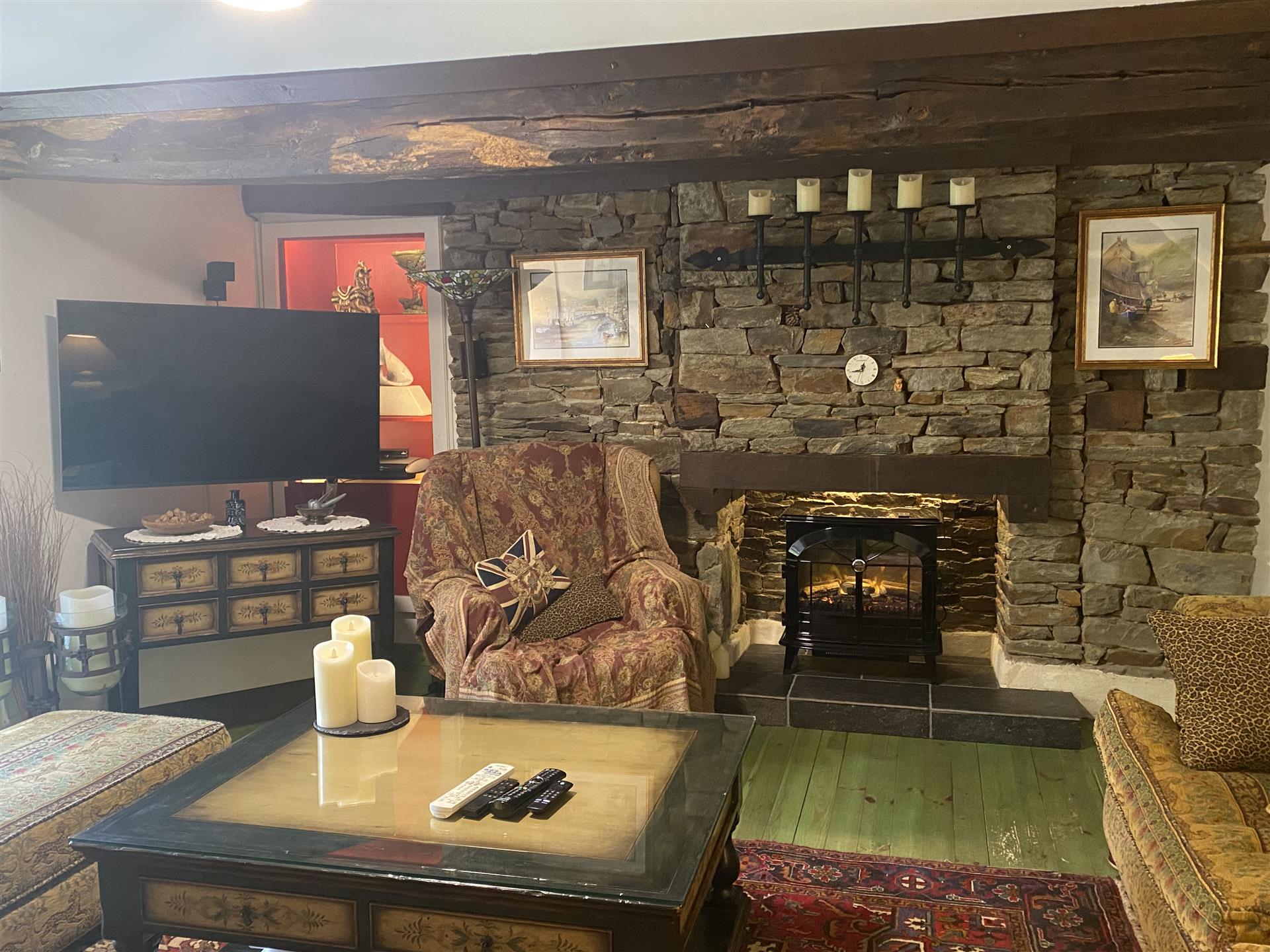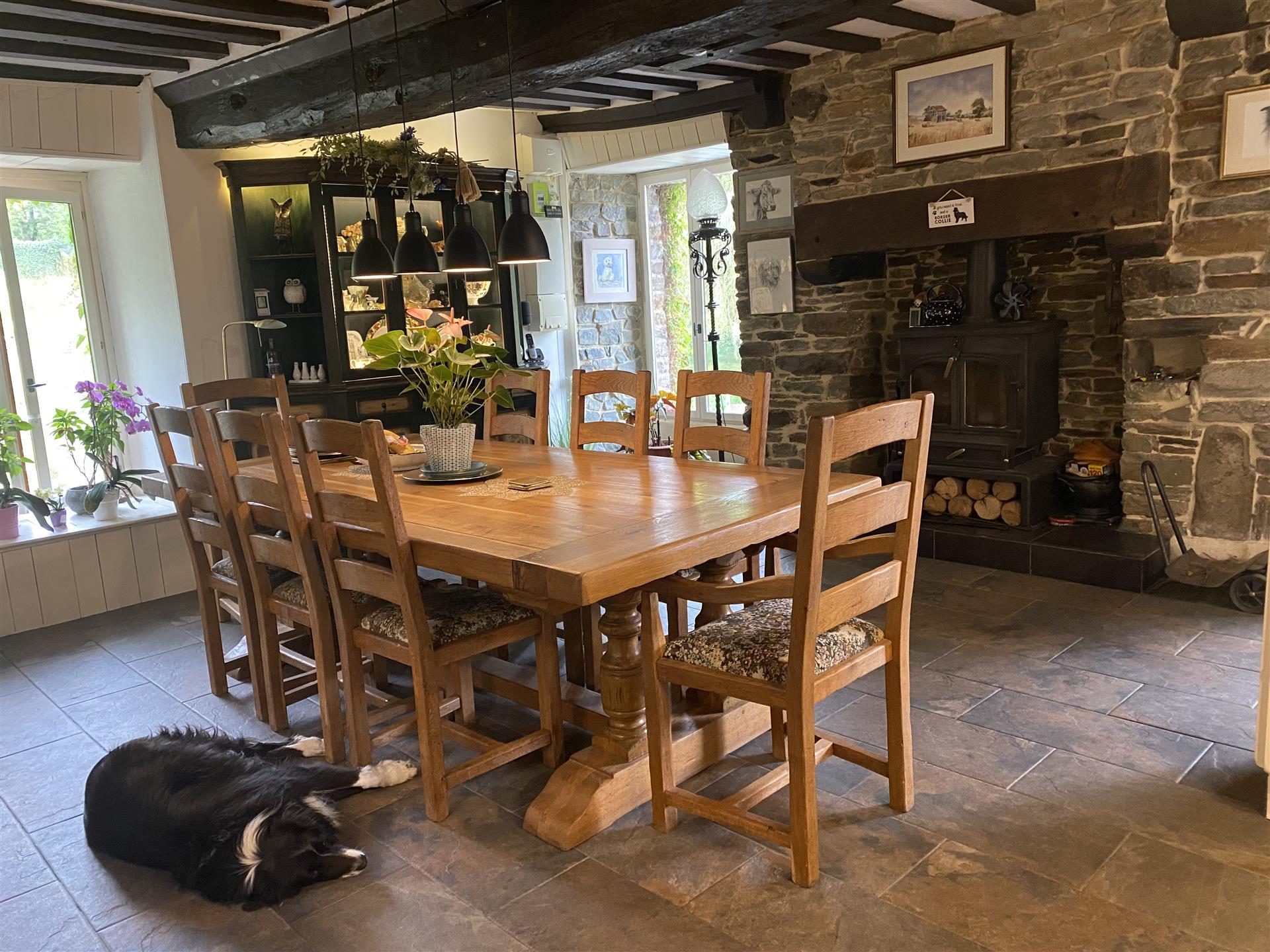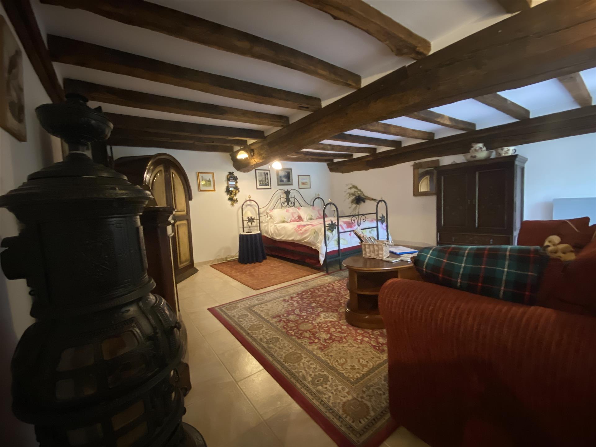 - Salon (4,61 m x 5,12 m) – avec cheminée décorative équipée d’un poêle à bois, pierres et poutres apparentes, deux fenêtres donnant sur le jardin et un radiateur électrique. Le réfrigérateur/congélateur n’est pas inclus dans la vente.