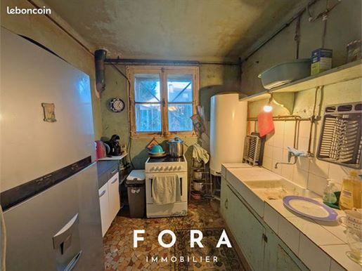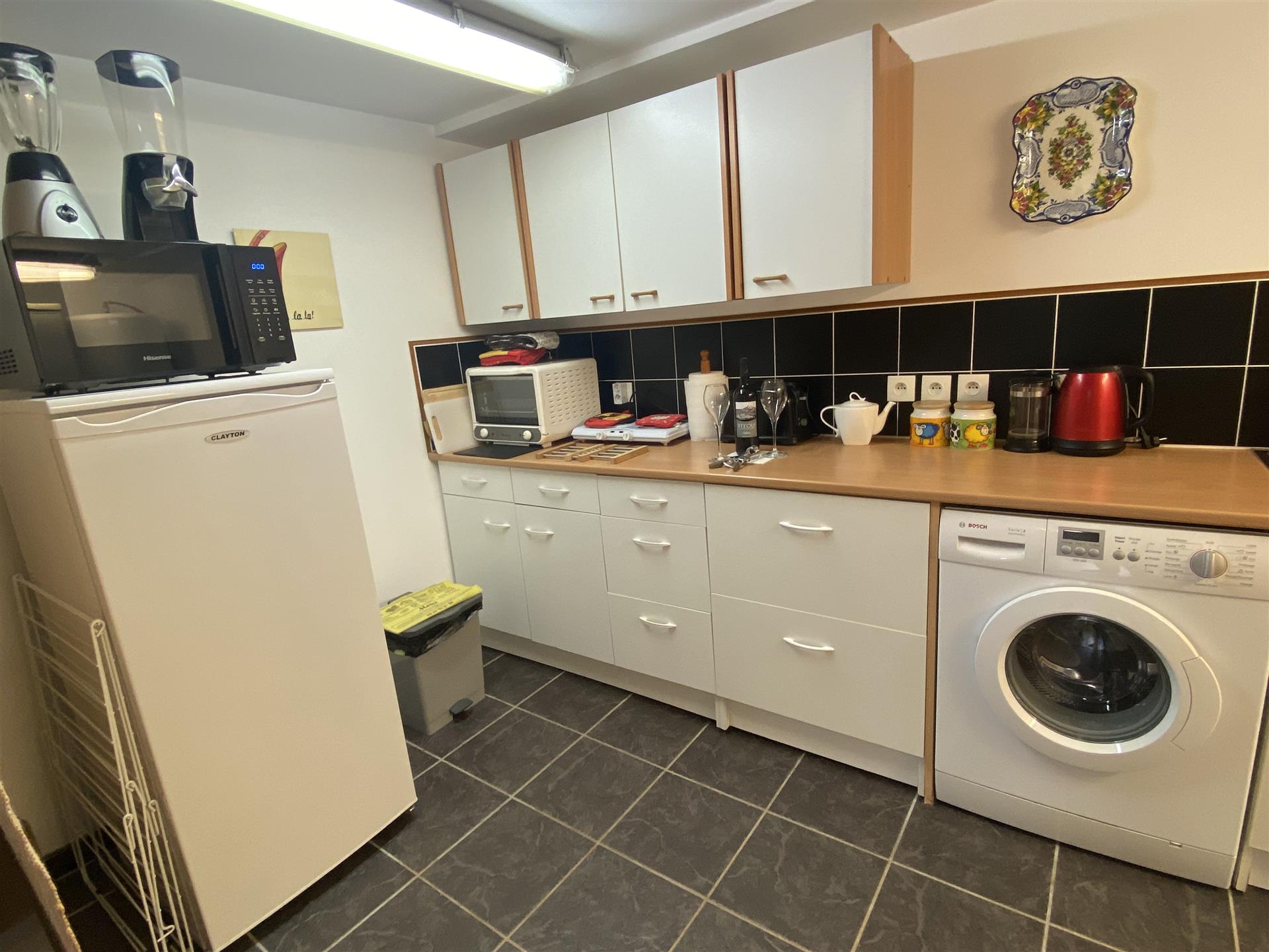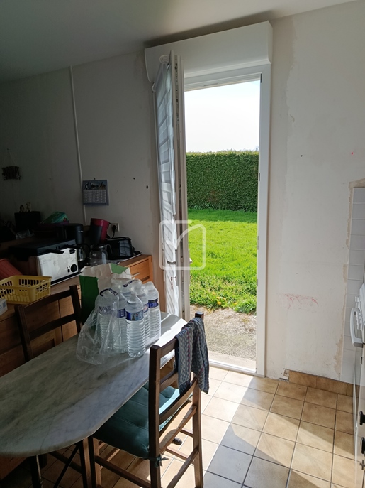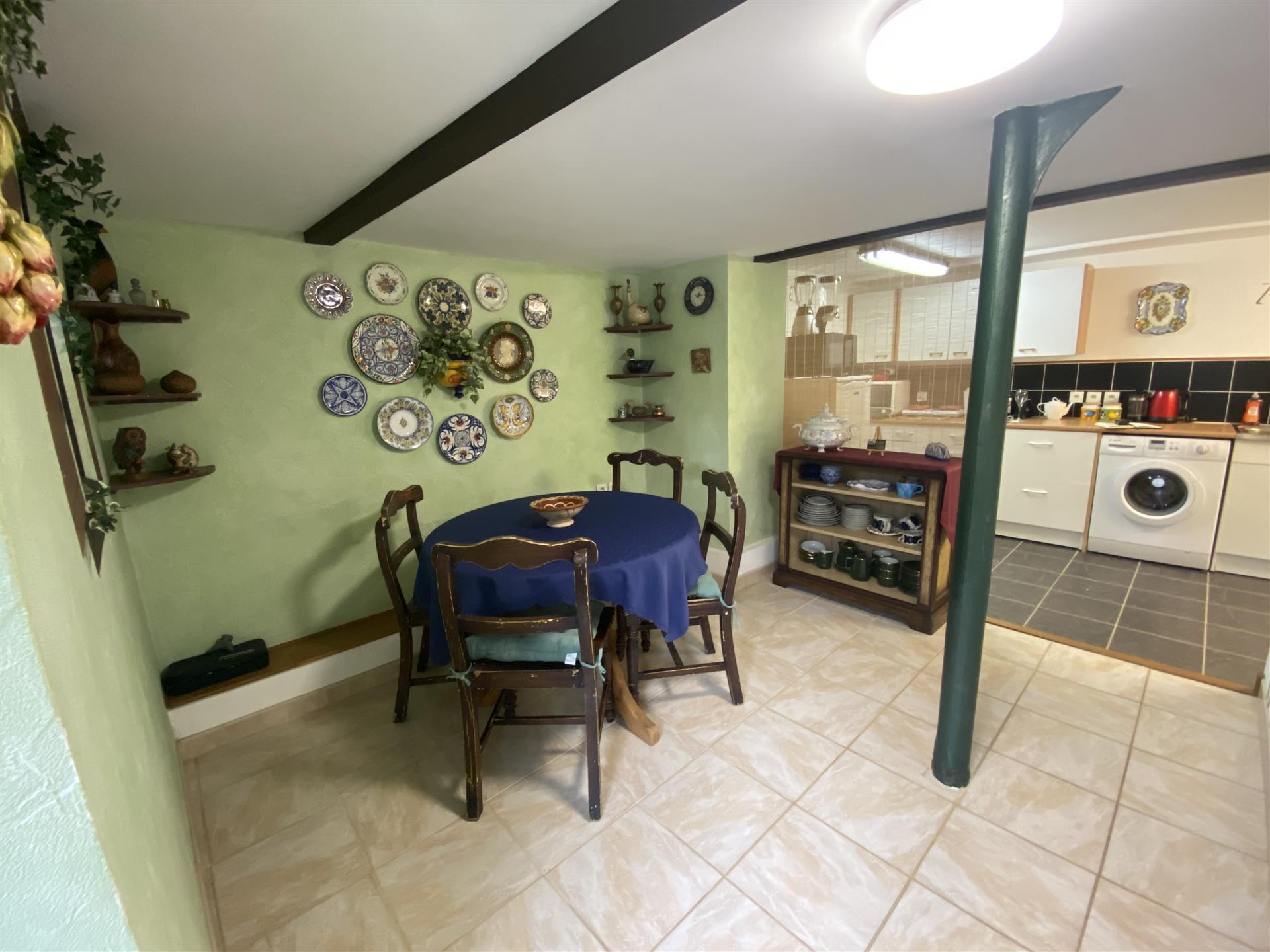 o Cuisine / salle à manger – pièce en L (4,16 m x 3,21 m) – avec meubles bas, évier, radiateur, une porte et une fenêtre donnant sur le jardin et deux autres fenêtres donnant sur la face latérale de la maison.