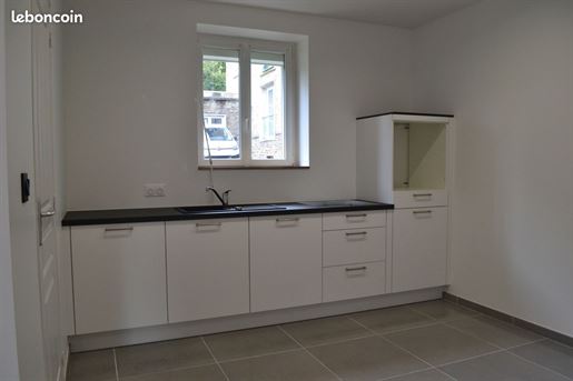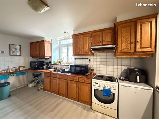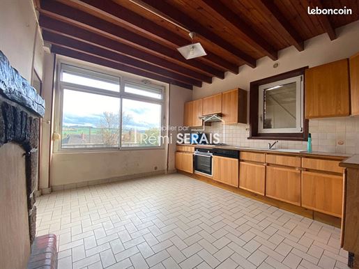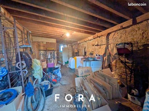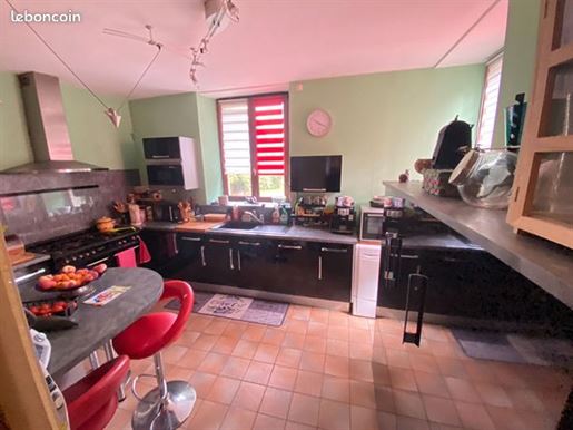 - Cuisine (5.11 m x 5,55 m) – avec une porte d’entrée et une fenêtre sur la même façade et une fenêtre donnant sur le jardin. Cette pièce comporte une cheminée avec insert, des poutres et des pierres apparentes, des dalles au sol et de multiples espaces de rangement avec des meubles hauts et bas.