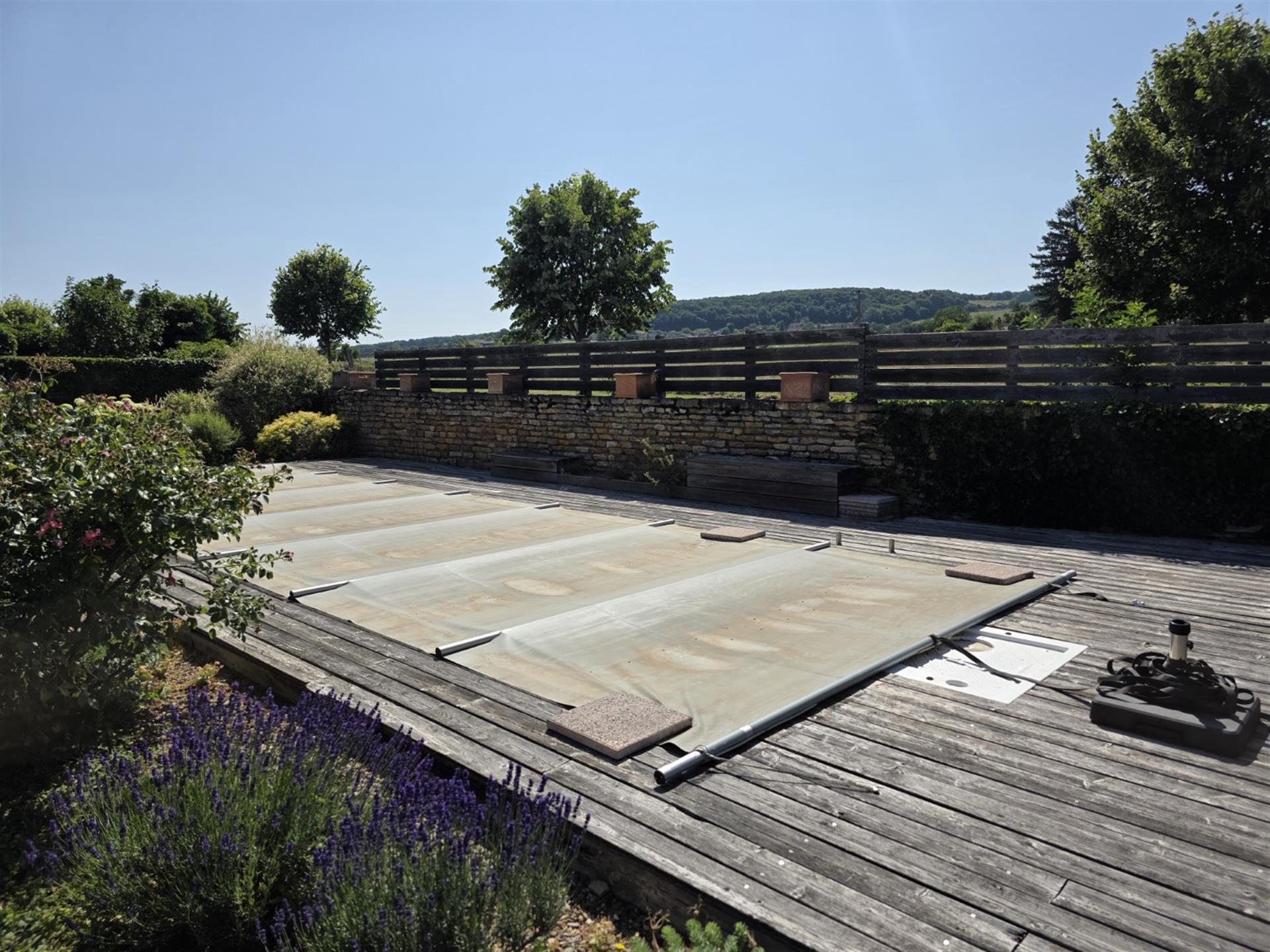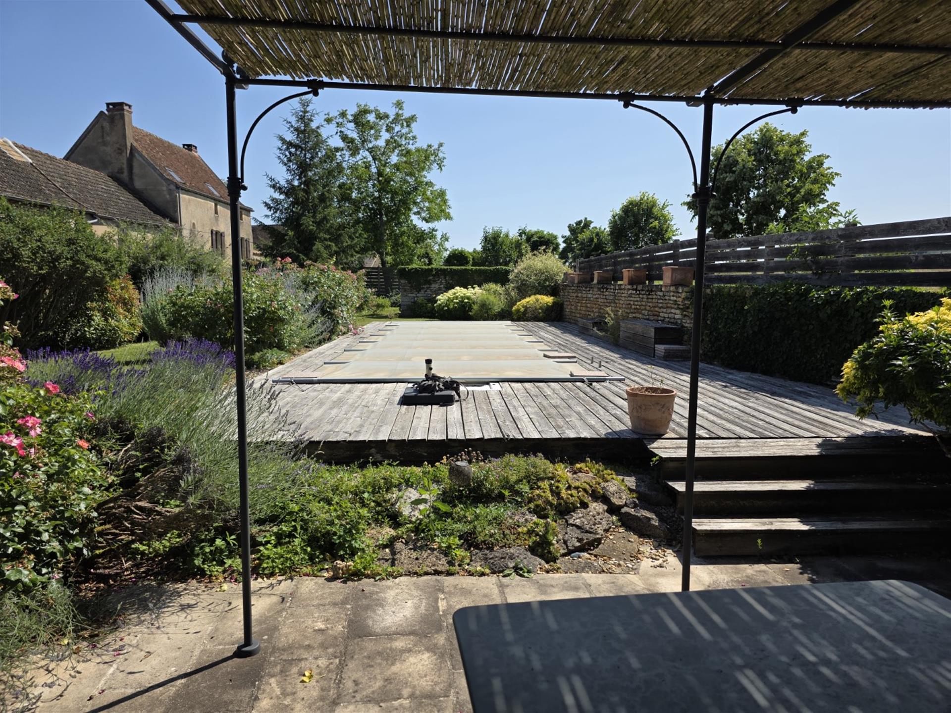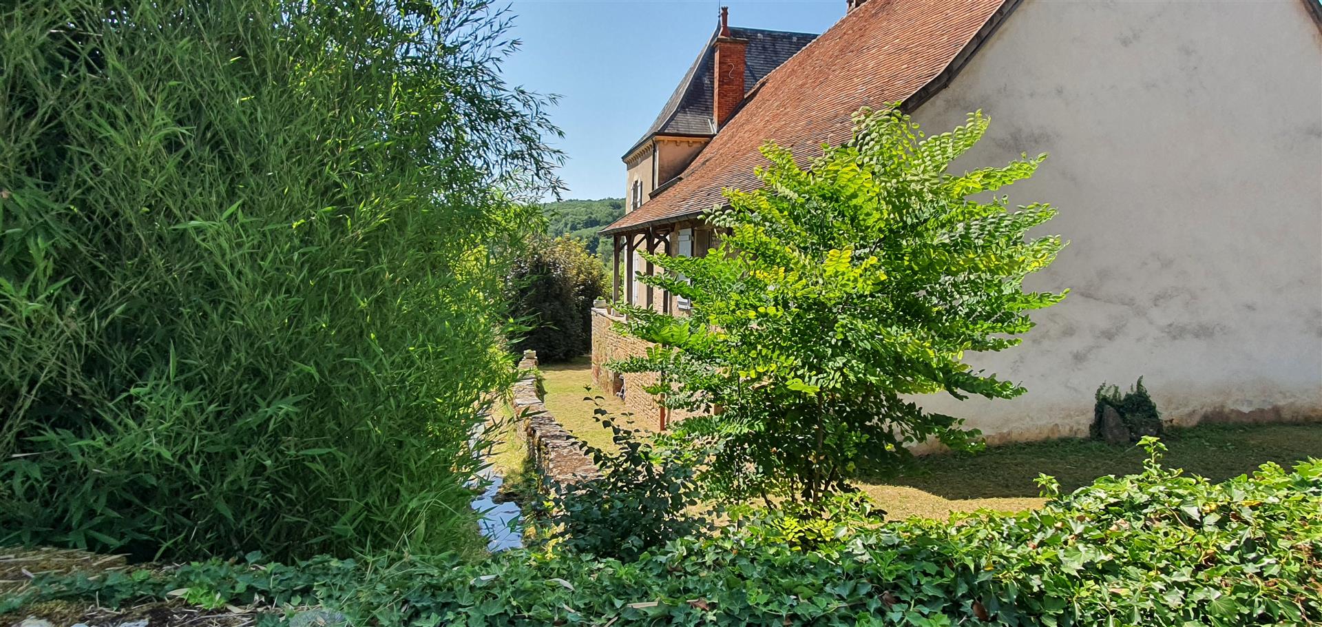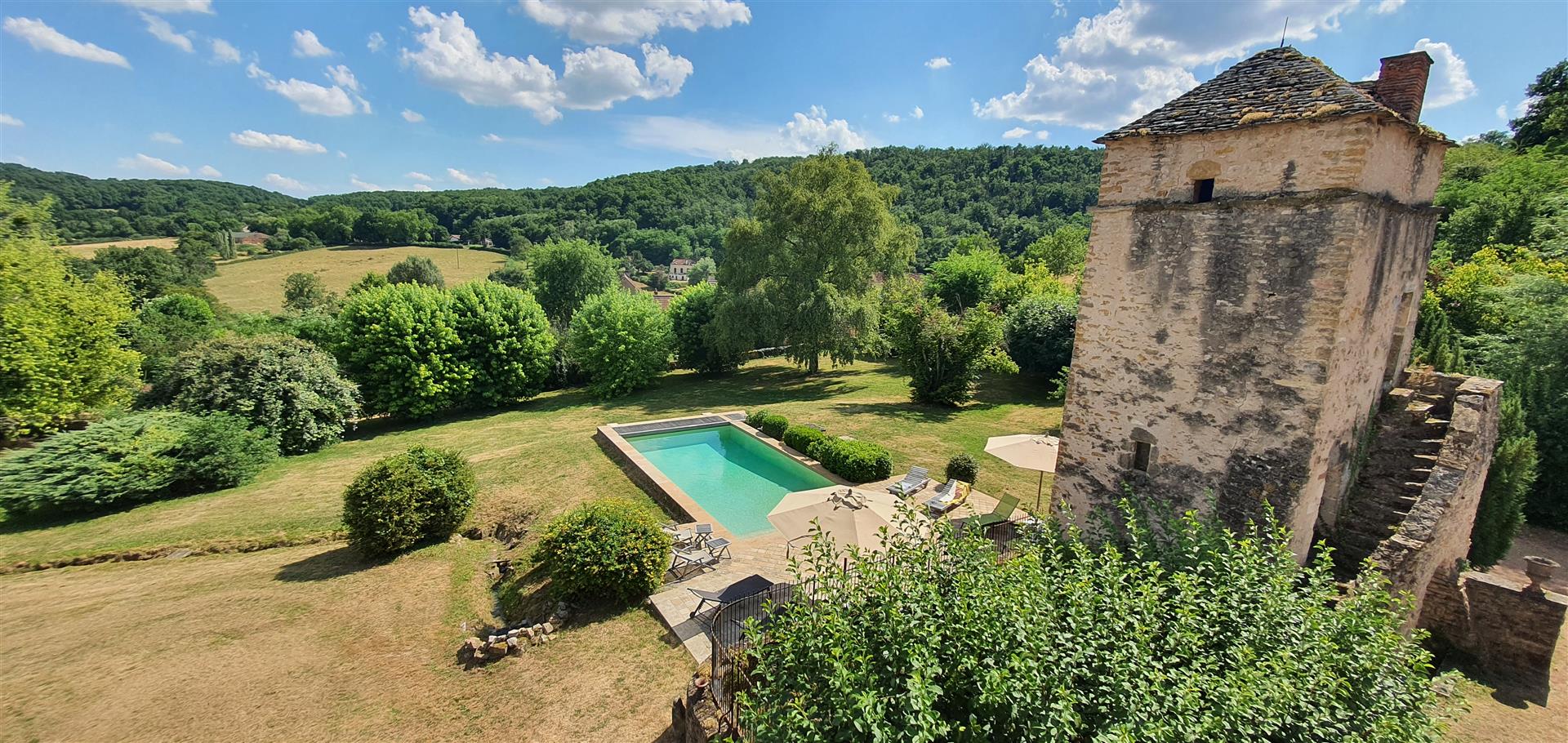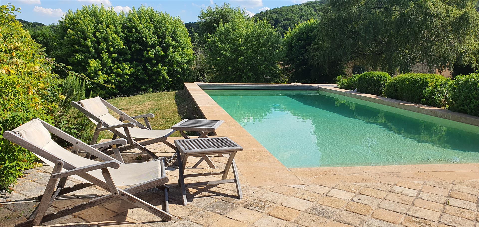 Le terrain en légère pente est parcouru par trois ruisseaux qui apportent la fraîcheur. Au pied du pigeonnier est installée une grande piscine dans le style des anciens bassins. Dominant le parc, la large plage en dalles de pierre permet de profiter pleinement du soleil et de la vue.