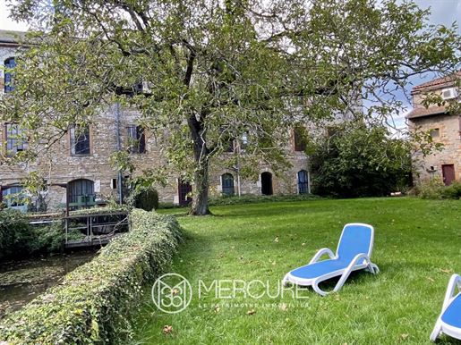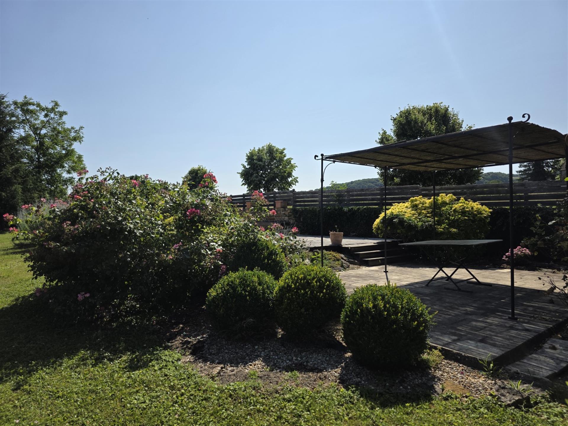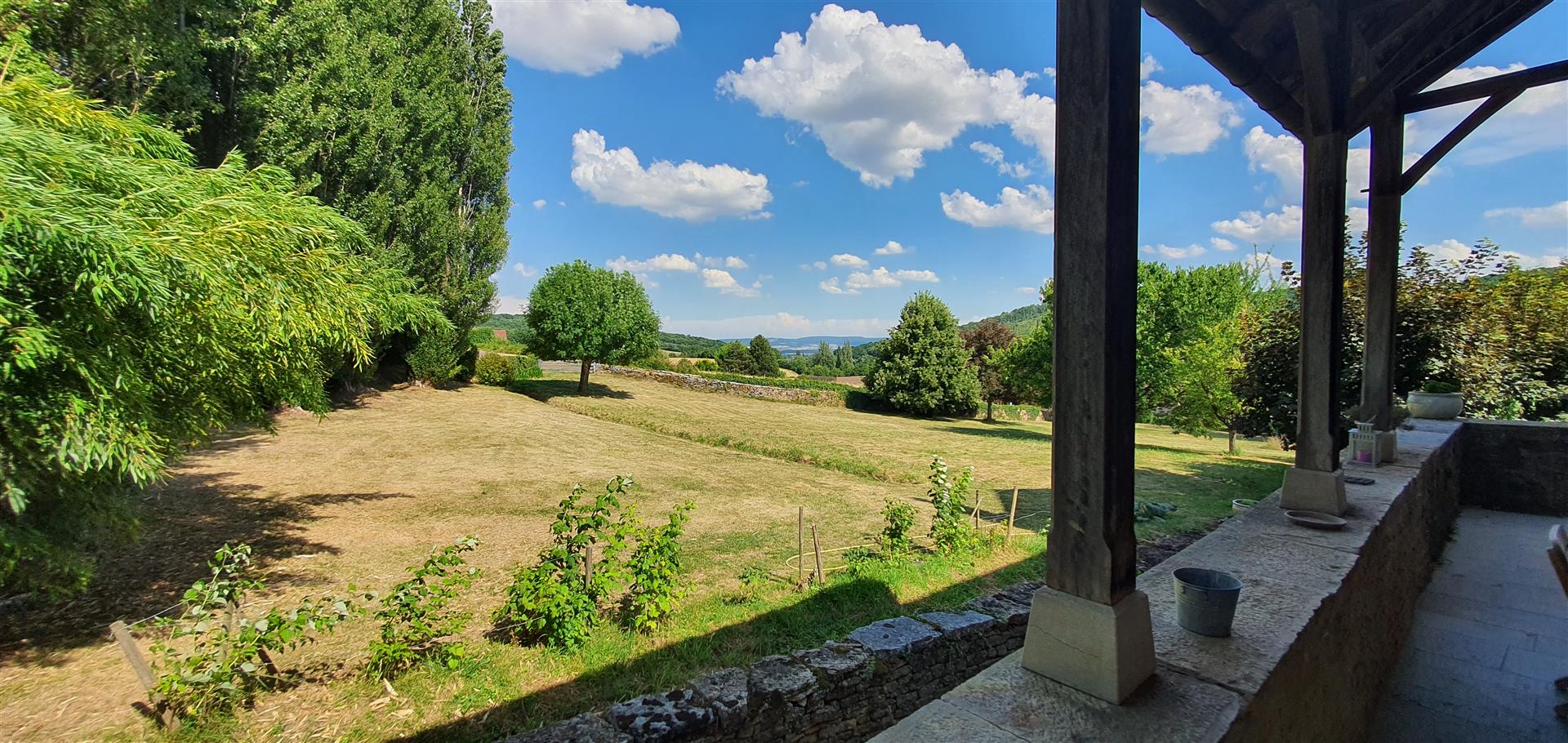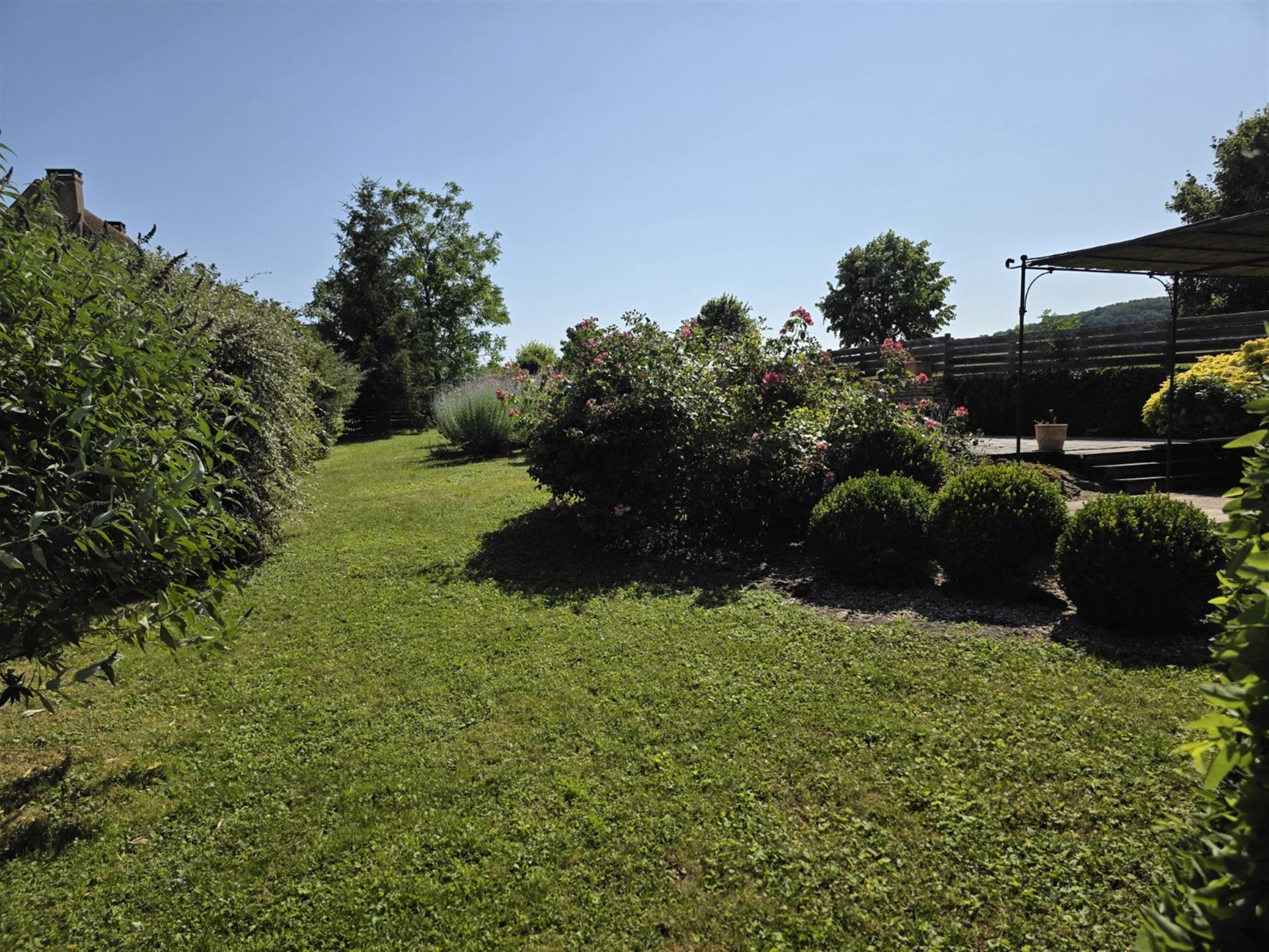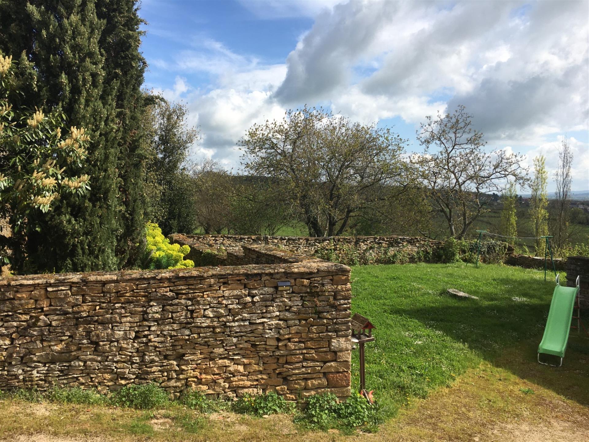 Le terrain en légère pente est parcouru par trois ruisseaux qui apportent la fraîcheur. Au pied du pigeonnier est installée une grande piscine dans le style des anciens bassins. Dominant le parc, la large plage en dalles de pierre permet de profiter pleinement du soleil et de la vue.