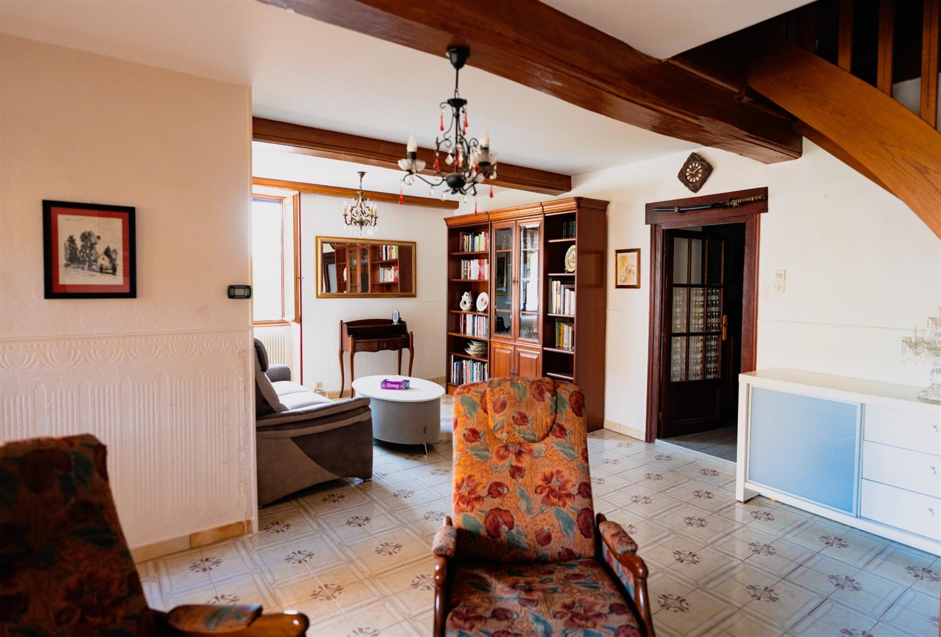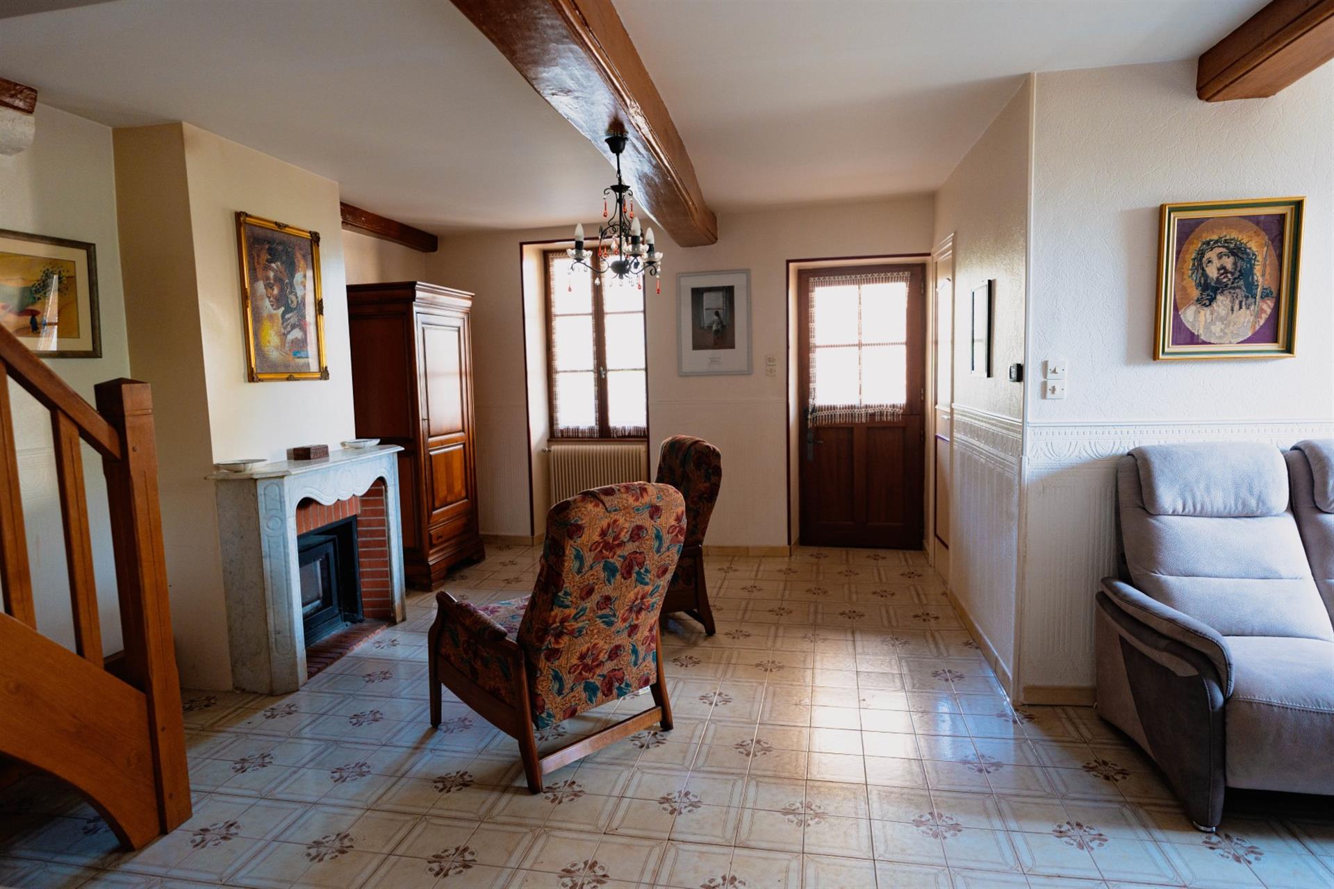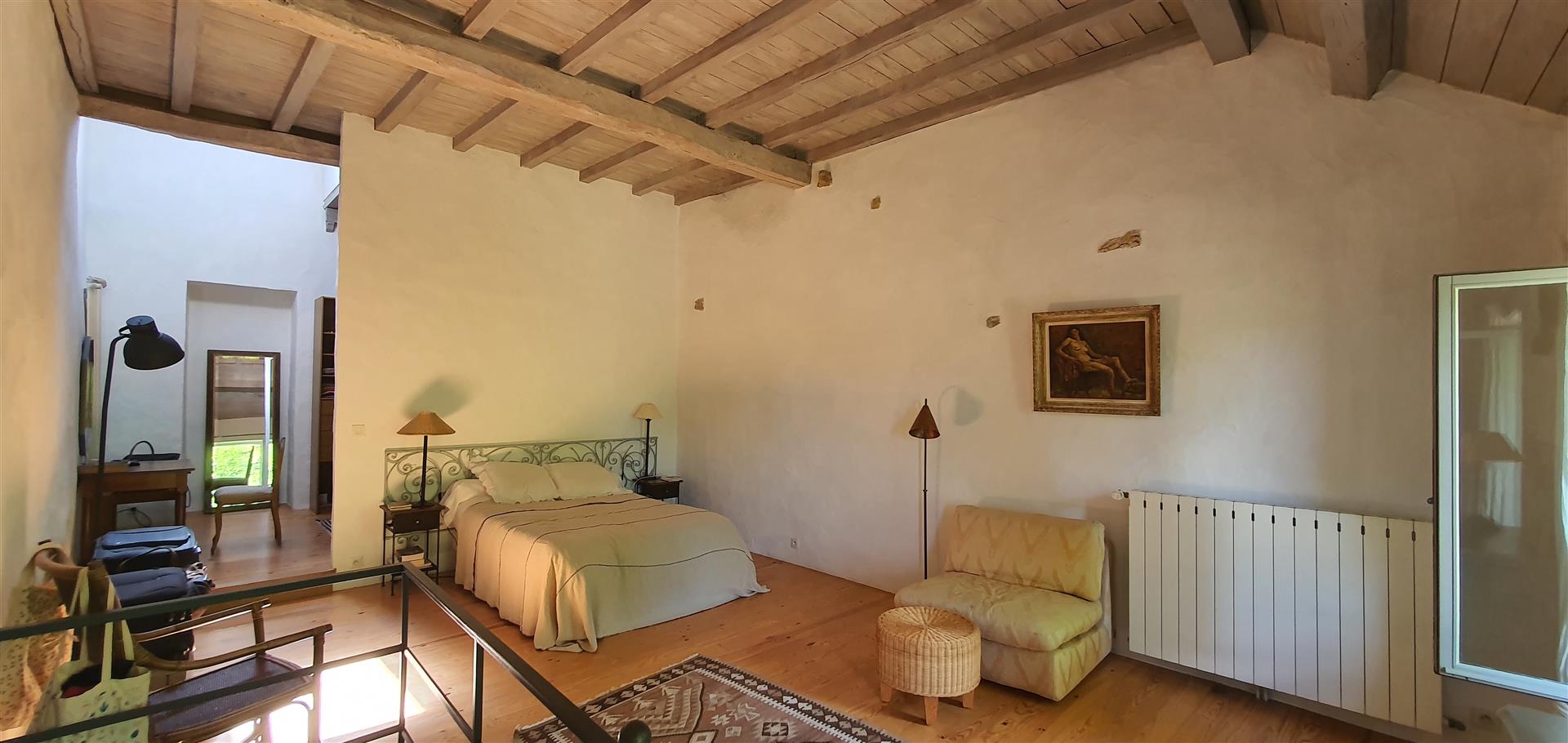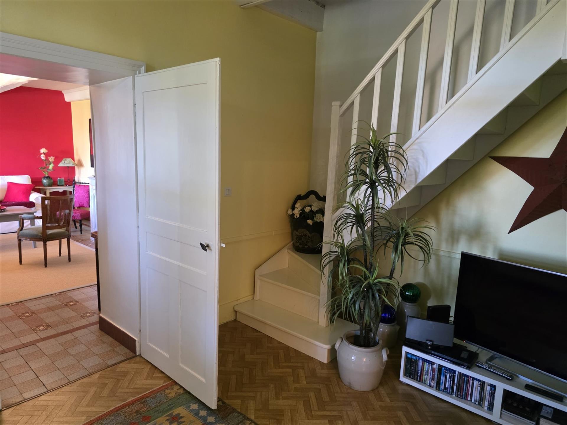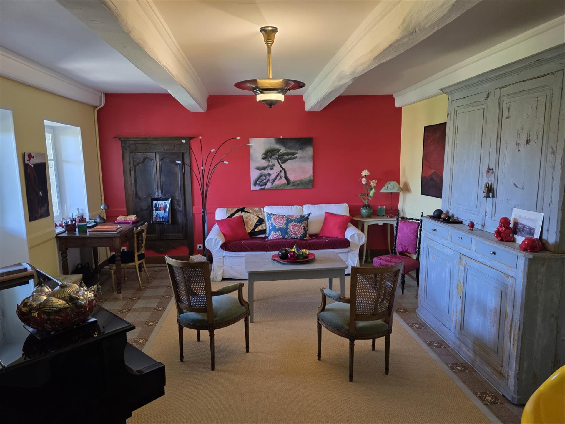 Arrivé au pied de la demeure, un large escalier en pierre mène à l'entrée principale de la maison. L’Intérieur, comme pour les maisons bourgeoises, est organisé pour recevoir. Un hall d’entrée avec l’escalier desservant l’étage donne accès, d’un côté, à un grand séjour lumineux percé de cinq fenêtres. De l’autre côté se trouve la grande cuisine qui s'ouvre de plain-pied à une longue galerie face à la vue. Suivent : Un petit salon du soir, un petit bureau, une salle de bains avec Wc et la chambre principale avec son grand dressing. On accède aux chambres de l’étage par une vaste salle de billard. Du côté de l’aile 18ᵉ, est aménagée pour les amis une impressionnante chambre sous charpente avec salle de bains et Wc. De l’autre côté, dans l’aile du 19ᵉ se trouve deux belles chambres qui se partagent une salle de bains avec Wc. Au-Dessus, le grand grenier est devenu un dortoir pour les enfants.