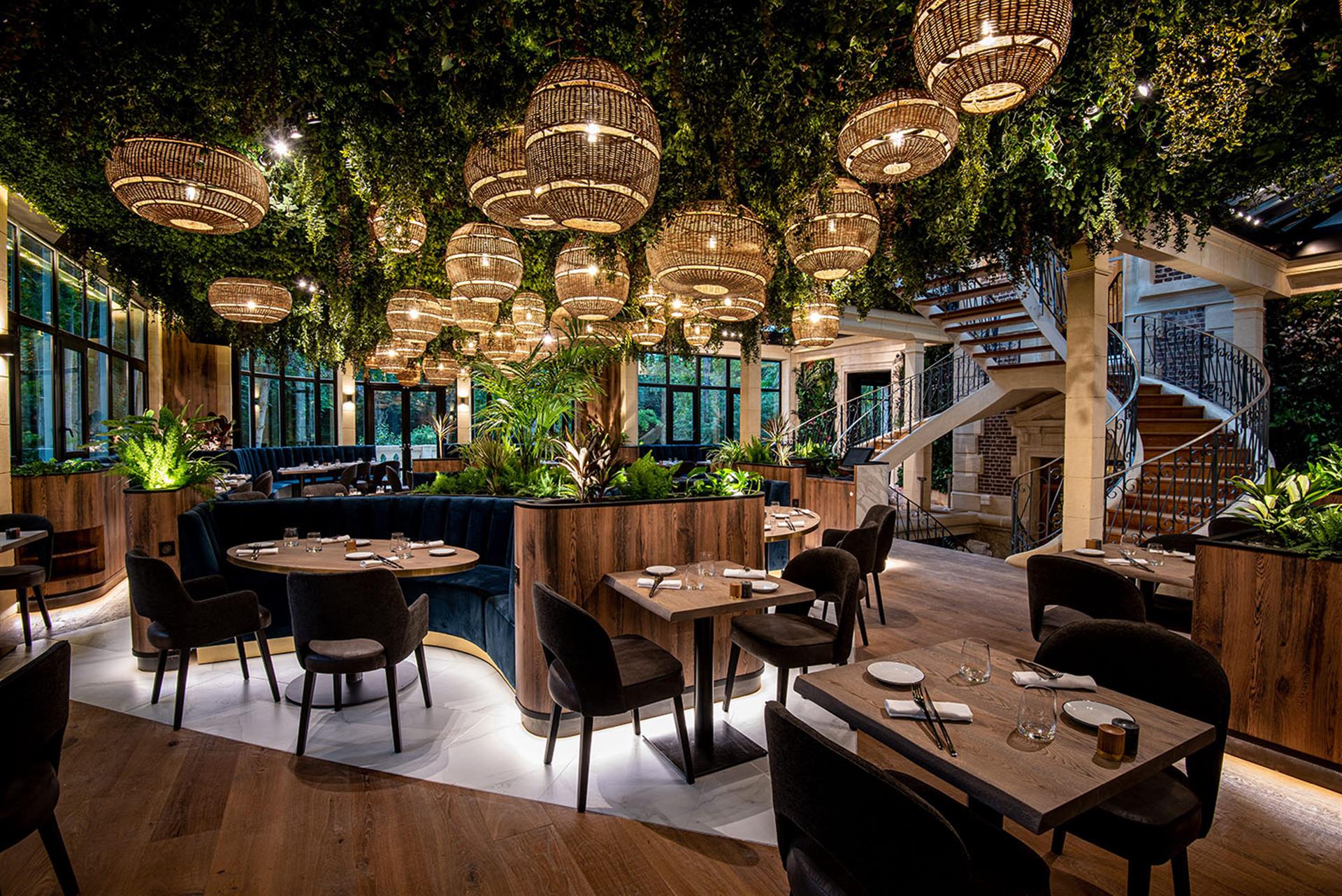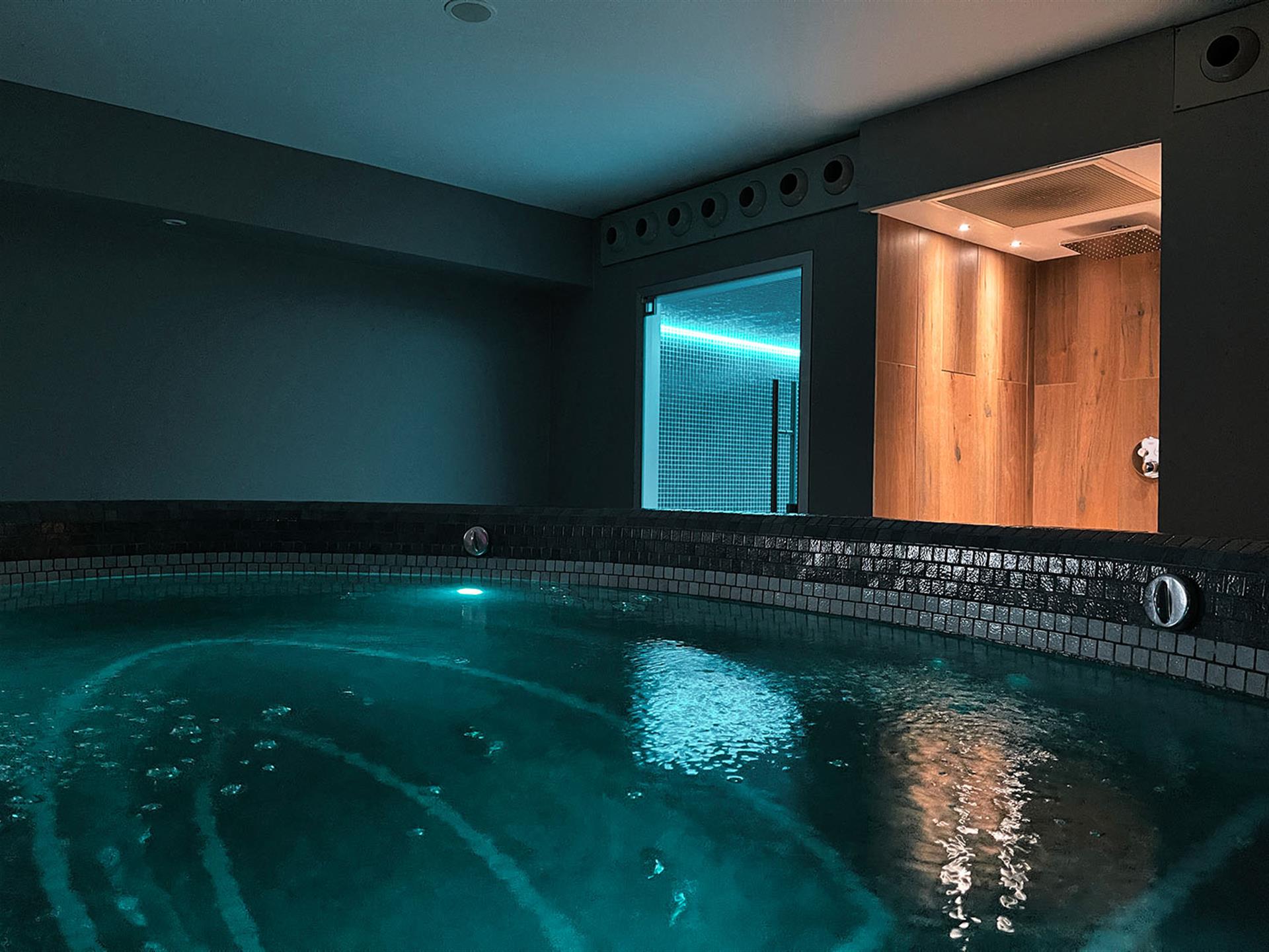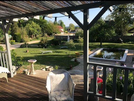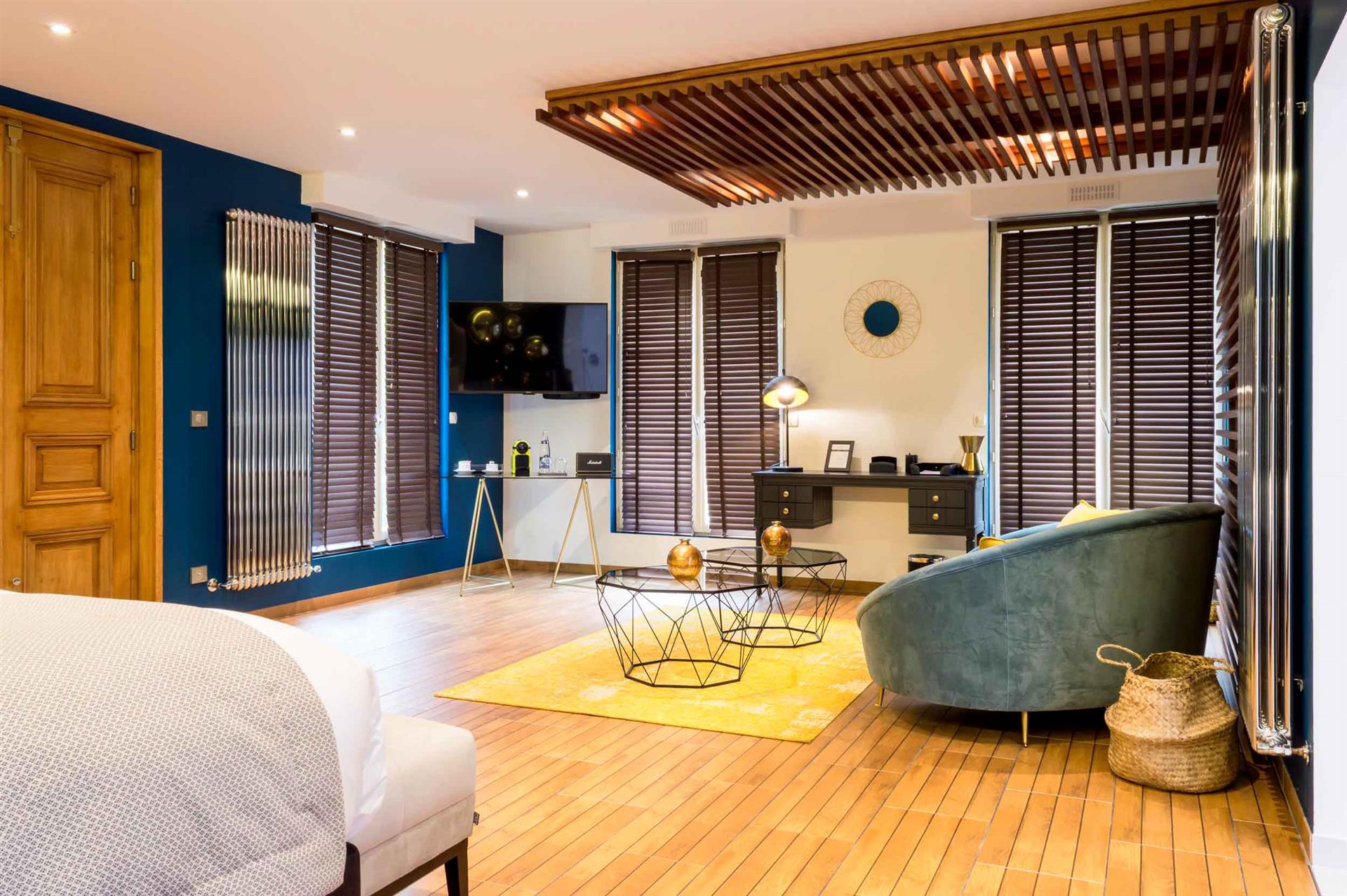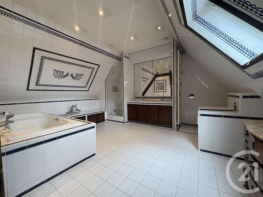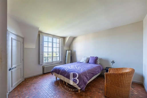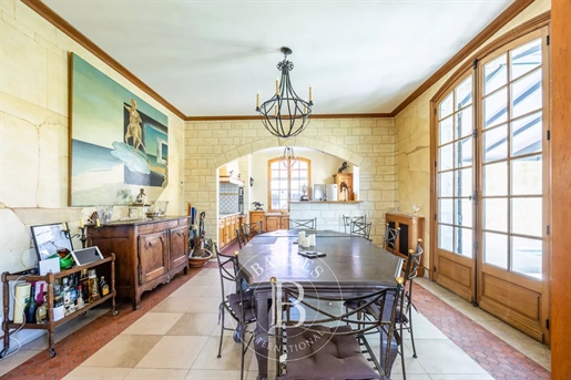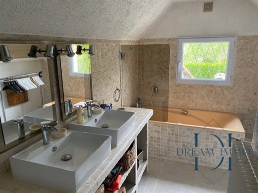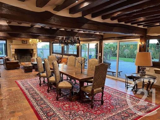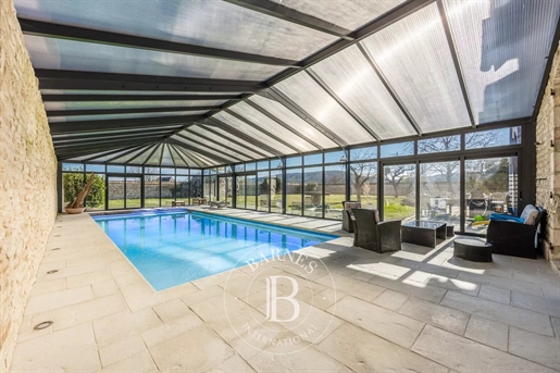 La maison principale d’environ 300 m² propose au rez-de-chaussée, une entrée desservant un espace bureaux, une cuisine ouverte sur une salle à manger (avec ouverture sur piscine intérieure chauffée 10x5m), un grand salon avec cheminée. À l’étage, une suite parentale avec sa salle de bains, ainsi que quatre chambres et deux salles de bains. Une pièce supplémentaire peut faire office de sixième chambre ou de salle de jeux. Un sous-sol de 150 m².