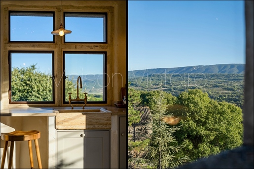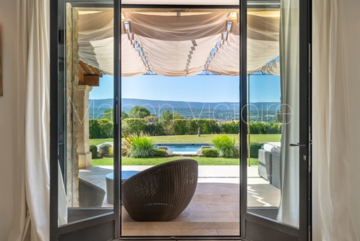 Le rez-de-chaussée comprend un vaste salon avec plafond cathédrale, poutres apparentes et cheminée, ainsi que de larges baies donnant sur la terrasse et offrant une superbe vue sur le Luberon une grande cuisine moderne entièrement équipée avec îlot central, plans de travail en granit du Brésil et vues imprenables à perte de vue. Ce niveau comprend également un bureau pouvant faire office de chambre, une chambre parentale avec placards intégrés et portes-fenêtres ouvrant sur la terrasse, une salle de bains avec baignoire et douche ciel de pluie, et des Wc invités.