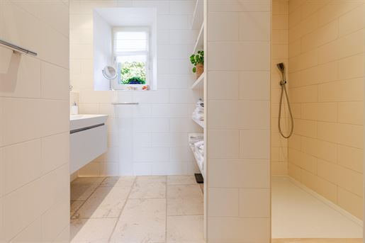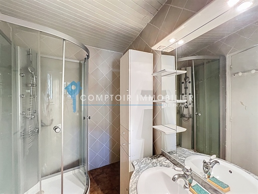 À l'étage se trouvent deux chambres, dont une équipée de placards intégrés, une salle de douche familiale avec double vasque, et des WC.