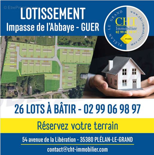Terrain 546 m² Guer Cht Immobilier vous propose de réaliser votre construction sur un terrain viabilisé de 546m2. Ce terrain se situe en lotissement, à proximité du centre ville de Guer, avec commerces, écoles et activités à proximité immédiate. Ce terrain est implanté au sein d'un lotissement de 26 lots, sur les hauteurs de Guer avec vue dégagée. Libre de constructeur, vous pourrez réaliser le projet qui vous convient. Découvrez également d'autres terrains entre 241m2 et 546m2. La commune de Guer est très dynamique, elle compte un peu moins de 7 000 habitants et accueille tous types de commerces (Boulangeries, Boucheries, Epicerie, Supermarché, Magasin de bricolage et de vêtements, Opticien...) un centre médical et deux pharmacies, et les écoles du primaire au lycée. Le milieu associatif est très développé, vous y trouverez à coup sûr votre activité en fonction de vos centres d'intérêts. Contactez vite Cht Immobilier au [Coordonnées masquées] pour réserverr votre terrain. Les informations sur les risques auxquels ce bien est exposé sont disponibles sur le site Géorisques : Vous avez un projet immobilier sur le secteur de Brocéliande ? Pour vendre, acheter ou louer une maison à Plélan le Grand, Guer, Beignon, Saint Malo de Beignon, Porcaro, Augan, Monteneuf, Concoret, Campénéac, Paimpont, Saint Péran, Iffendic, Monterfil, Montfort sur Meu, Saint Thurial, Bovel, Loutehel, Val d'Anast, Maxent, Treffendel, Saint Malon sur Mel, Baulon... Contactez nous. Sept conseillers à votre service, trois vitrines à Plélan le grand, Saint Cyr Coëtquidan et Beignon et publication de nos annonces sur plus de 80 sites internet. Plus d'offres sur [Url masquée pour votre sécurité] Surface : 546 m² Consommation énergie primaire : Non communiqué Consommation énergie finale : Non communiqué