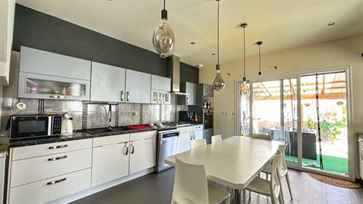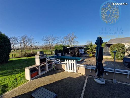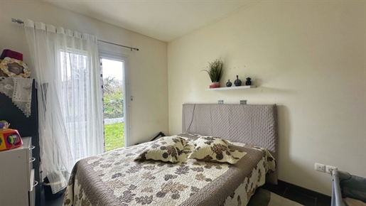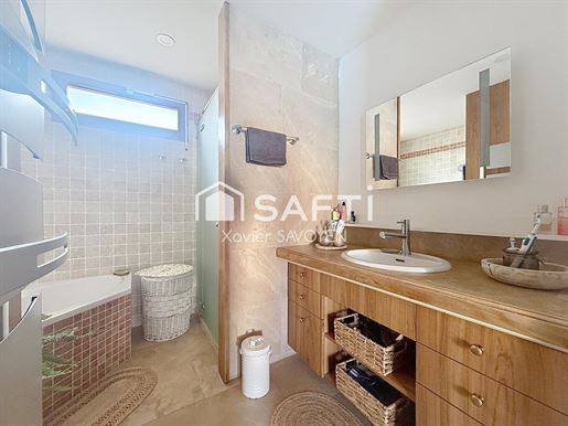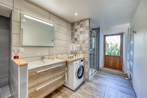 Rez-de-chaussée : la vie en vrai plain-pied Cuisine équipée ouverte sur la salle à manger Salon baigné de lumière (baie vitrée + porte vitrée + verrières) 1 Chambre confortable Salle d’eau moderne avec douche à l’italienne et buanderie. Wc indépendant. Un espace complet, propre, pratique et parfaitement entretenu.