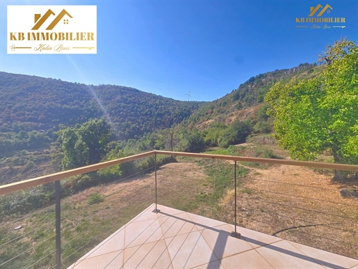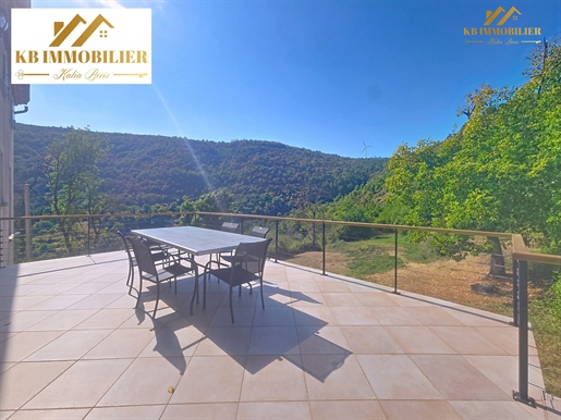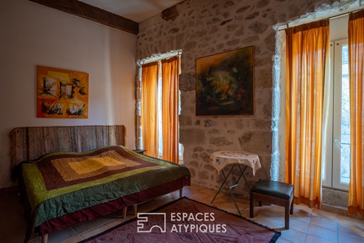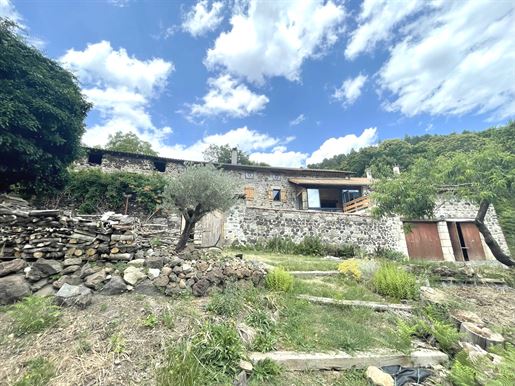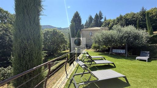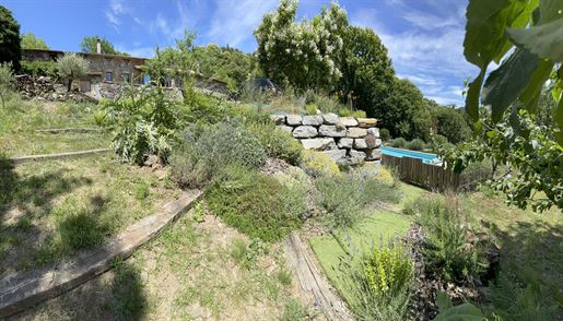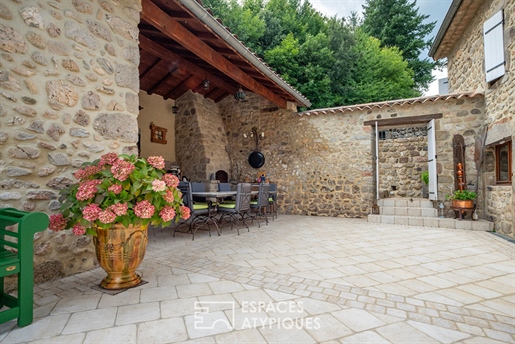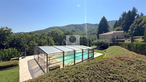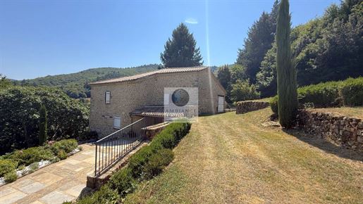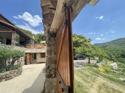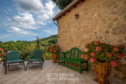 Cette ancienne ferme ardéchoise bâtie en 1850 et entièrement rénovée se dresse fièrement sur une colline. De là, elle domine la vallée et offre, depuis ses terrasses comme depuis son terrain, une vue imprenable sur les reliefs montagneux de l'Ardèche, comme une invitation à la contemplation.