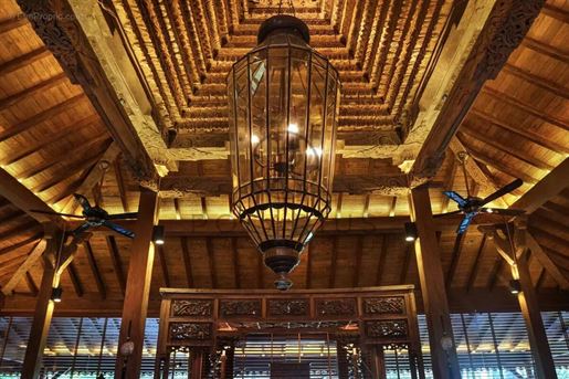 Ce domaine n’est pas une simple villa, mais un ensemble soigneusement conçu de quatre résidences traditionnelles, réalisées entre 2012 et 2020 à partir d’antiquités rares, de bois précieux authentiques et de structures originales en provenance de Java et Sumatra, certaines datant de plus de 100 ans.