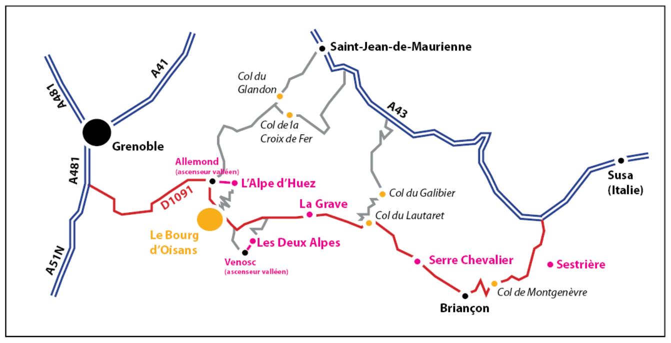 - sur la commune de Bourg d’Oisans (avec tous les services : crèche, école, collège, maison médicale, cinéma, piscine, commerces…), commune régulièrement « ville étape » du Tour de France,