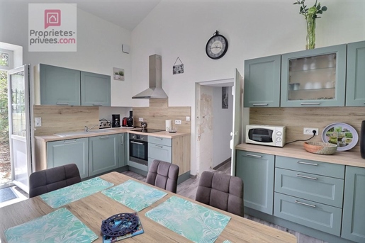 Développant environ 127 m², la maison, située sur une butte, s'inscrit sur un ensemble de parcelles totalisant 2 700 m². L'essentiel du terrain, situé en face de la maison (route de hameau très peu passante), offre un bel espace mêlant jardin et partie boisée, propice à la détente et à la vie au grand air.