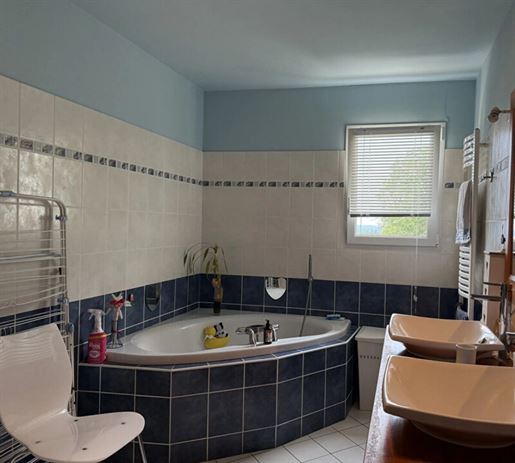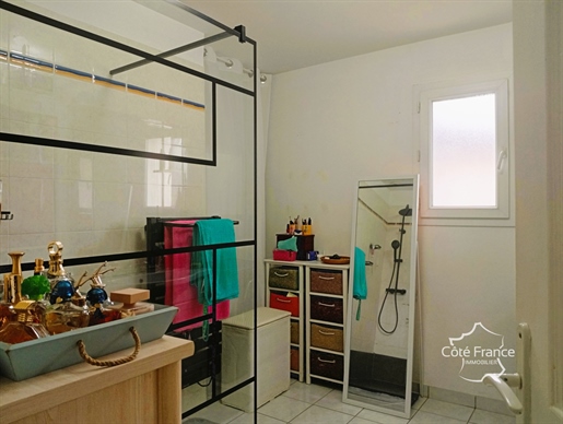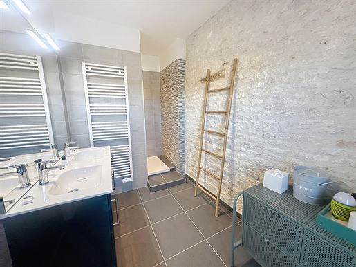A l'étage : deux chambres et salle de jeux dans le pigeonnier, salle d'eau, wc. Caves et espaces de rangements sous la maison environ 80 m².