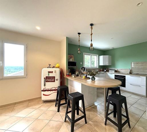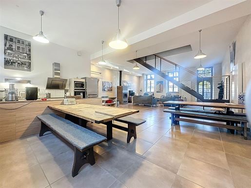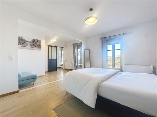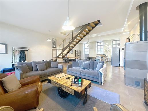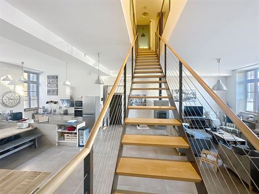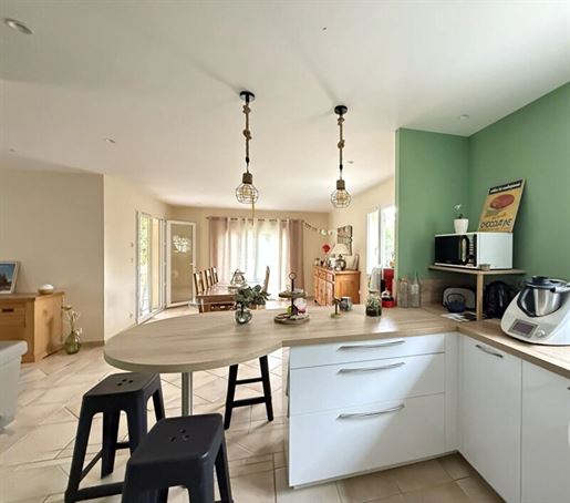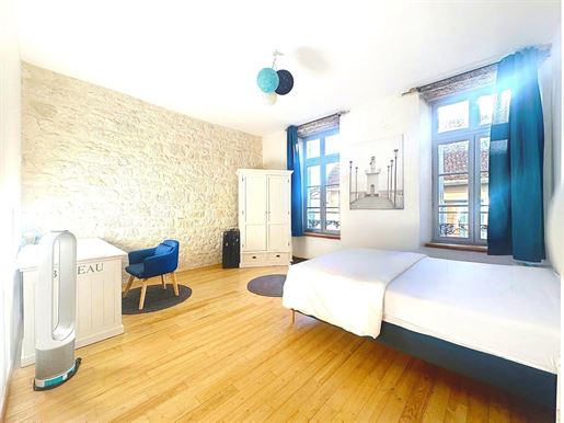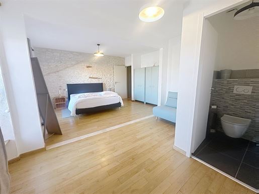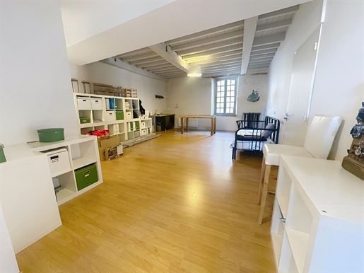 En rdc : grande pièce à vivre lumineuse de près de 60 m², grande chambre, cuisine entièrement équipée, salle d'eau, buanderie, wc