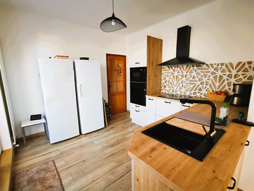 La pièce de vie spacieuse et lumineuse accueille un salon-séjour convivial et une cuisine ouverte aménagée et équipée, avec emplacements prévus pour lave-linge et lave-vaisselle. Un espace idéal pour vivre et recevoir.