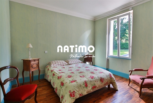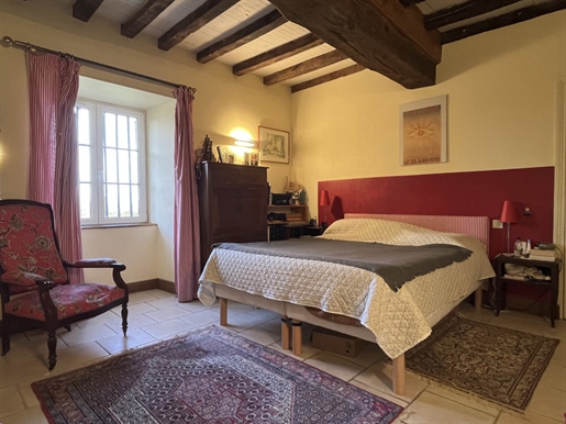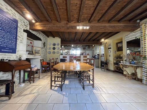 Pierres et poutres apparentes, cheminées. Chauffage par pompe à chaleur (radiateurs à l'étage et chauffage au sol au rez-de-chaussée), double vitrage partout, deux fosses septiques, taxe foncière : 1041€. Dpe : B.