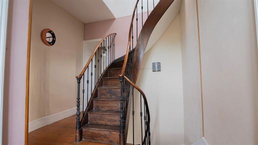 Un élégant escalier s'élève depuis le salon principal et se courbe pour atteindre le palier central du premier étage. On y trouve de hauts plafonds et un parquet ancien parfaitement poli.