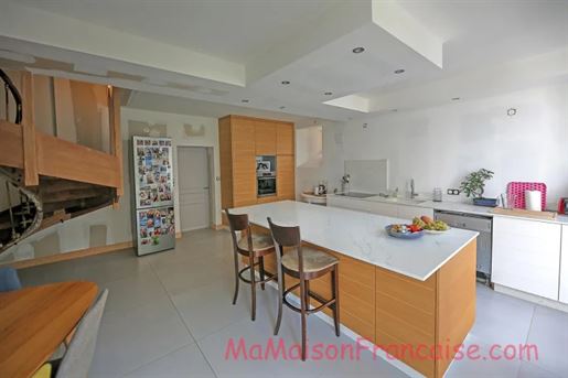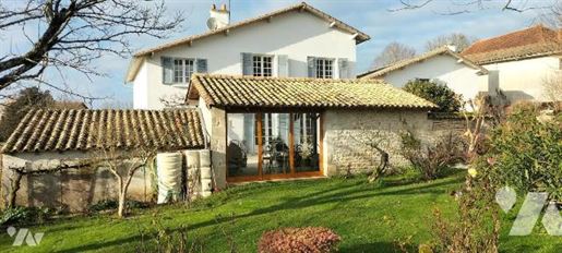 Hall central avec sol carrelé, rosace et corniche en plâtre, et placard intégré. À droite se trouve le salon double avec plafond en plâtre décoré, deux fenêtres à l'avant et deux à l'arrière, parquet, placards intégrés et deux cheminées en marbre. À l'arrière du hall se trouve un bureau avec sol carrelé, portes-fenêtres à l'arrière et plafond en plâtre. La cuisine est équipée d'un sol carrelé, d'un escalier d'origine, d'une fenêtre et d'une porte à l'arrière, d'une cheminée charentaise avec poêle à bois. Elle est entièrement équipée avec un grand îlot central et un four, une plaque de cuisson et un lave-vaisselle encastrés. Une buanderie pratique et une chaufferie avec une porte sur le côté complètent cet espace. À gauche du hall se trouve une chambre ou une autre pièce de réception avec parquet et fenêtre à l'avant. Une salle d'eau et des toilettes complètent le rez-de-chaussée.