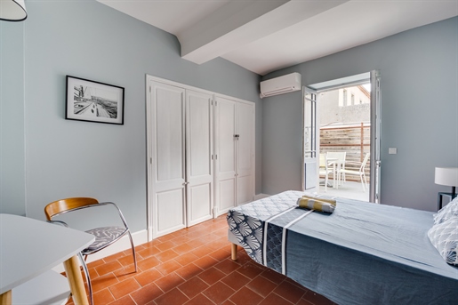 Accès à une cour avec jardinet d'environ 20 m², comprenant un barbecue et un espace de rangement.