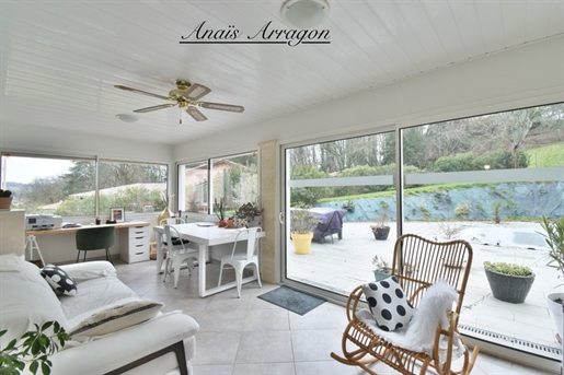 Depuis la pièce de vie, la véranda crée une transition naturelle entre intérieur et extérieur, avec un accès direct à la terrasse et à la piscine, idéale pour les repas en famille ou entre amis.