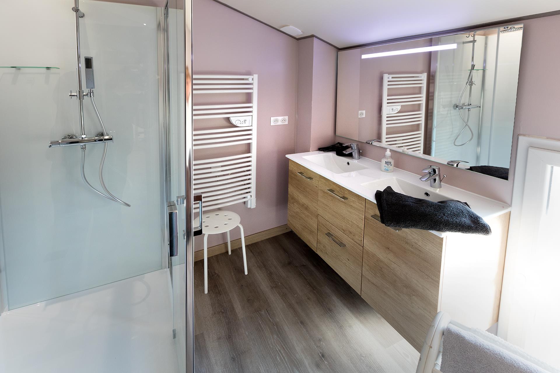 À l’étage, deux spacieuses chambres d’environ 14 m² chacune offrent confort et tranquillité. Elles sont complétées par une salle d’eau moderne équipée d’une douche à l’italienne, d’une double vasque, ainsi qu’un Wc indépendant.