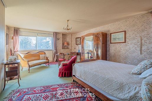 Quelques marches plus bas, la circulation en demi-niveaux dévoile un dégagement desservant une salle d’eau avec Wc, un bureau, ainsi qu’un espace parental indépendant composé d’une chambre, d’un dressing et d’un salon privatif, formant un cocon intime au sein de la maison.