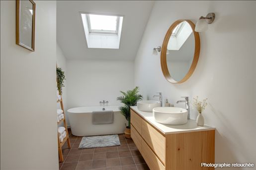 à l'étage : un dégagement, deux chambres (18,32 m2 et 32,7 m2) dont une suite parentale de avec salle d'eau équipée d'une douche, meuble vasque, et dressing, une salle de bains avec baignoire, meuble vasque et Wc, une antichambre de 10,42 m2 avec escalier permettant l'accès à l'étage supérieur,