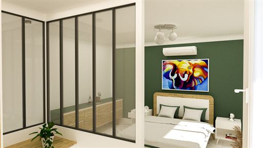 - à l'étage un couloir dessert une chambre, une salle de bains avec Wc, une grande chambre traversante avec dressing, pouvant être divisée afin de créer 2 chambres (initialement 2)