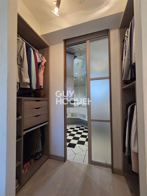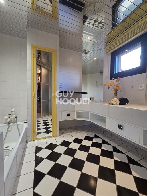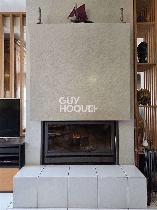La maison offre 131,78 m² habitables et 197 m² au total, incluant double garage, buanderie, cellier, cave et ateliers, offrant ainsi des espaces pratiques et fonctionnels au quotidien.