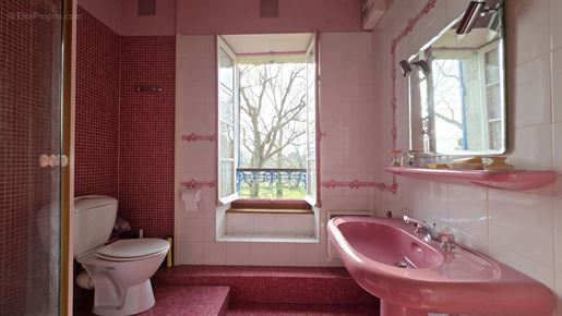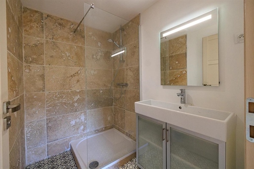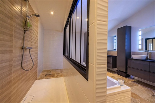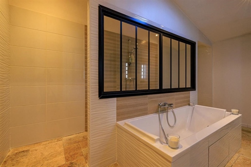 Dans le prolongement, la salle de bain offre de beaux volumes et un vrai espace bien-être, avec une baignoire d'angle balnéo, une grande douche, une double vasque, et le cumulus discrètement installé dans un renfoncement prévu à cet effet. Les Wc sont séparés.