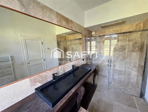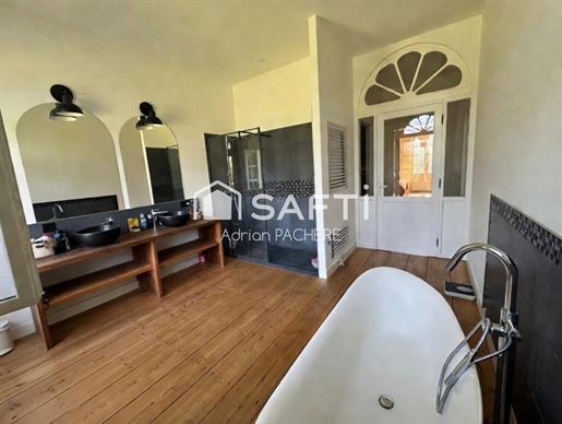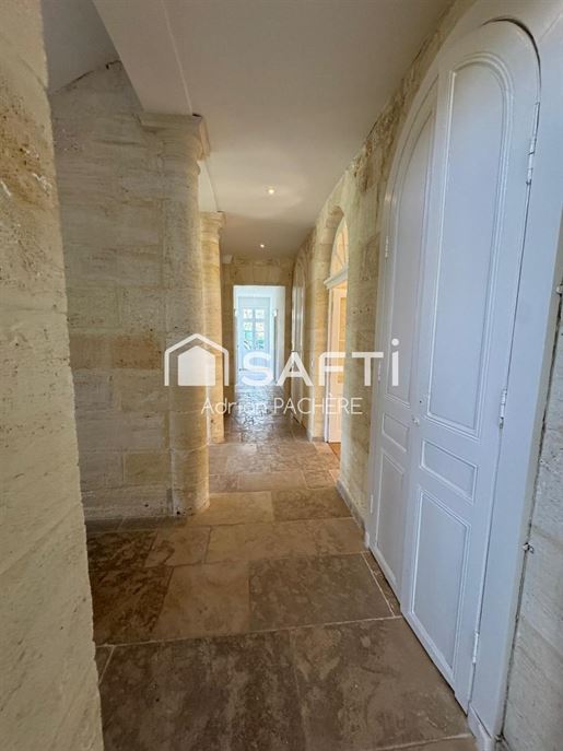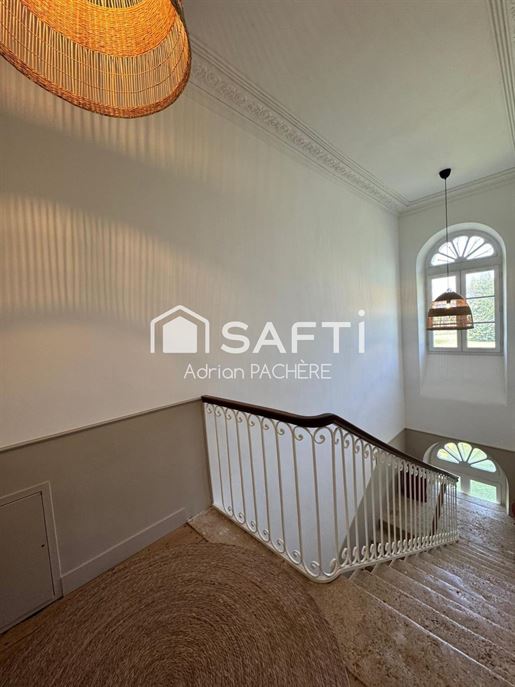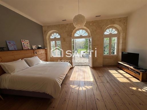 Derrière son élégante façade en pierre se dévoile une Maison de Maître pleine d’âme, où chaque espace invite à imaginer une nouvelle histoire. Ici, le temps semble suspendu, offrant un cadre idéal pour donner vie à vos projets les plus chers : maison familiale, chambres d’hôtes, gîtes de charme ou encore un domaine dédié aux événements et à l’art de recevoir. Dès l’arrivée, le parc de plus de 2,2 hectares séduit par sa beauté et sa sérénité. Les arbres majestueux, les espaces soigneusement aménagés et la piscine esprit lagon créent une atmosphère de vacances permanente. Un lieu où l’on se sent immédiatement bien, loin de l’agitation, proche de l’essentiel. La maison principale allie avec finesse le cachet de l’ancien et le confort moderne. La vaste pièce de vie, baignée de lumière grâce à ses grandes ouvertures, est une véritable invitation au partage. La cuisine ouverte, entièrement équipée, promet de beaux moments gourmands en famille ou entre amis. Au rez-de-chaussée, trois chambres, une salle d’eau et une buanderie offrent une organisation fluide et fonctionnelle. À l’étage, la suite parentale est un véritable cocon : généreux dressings, salle de bain raffinée, et une ambiance propice au repos et à la détente. Les dépendances viennent enrichir ce lieu unique : chai et grange aux volumes impressionnants, déjà porteurs de multiples possibilités. Le chai rénové de 80 m2 abrite un appartement indépendant ainsi qu’un espace spa, parfait pour accueillir, se ressourcer ou développer une activité touristique haut de gamme. Pensée pour le confort et la tranquillité de tous, la propriété dispose d’un jardin clos, d’une aire de jeux pour les enfants, de plusieurs accès indépendants, ainsi que d’équipements modernes : alarme, domotique, portail électrique. Entièrement rénovée en 2022, cette demeure a su conserver son charme d’antan tout en offrant des prestations actuelles de grande qualité. Un subtil équilibre entre authenticité et modernité. Et pour ceux qui rêvent encore plus grand, il est possible d’acquérir 1,5 hectare supplémentaire, avec une grange rénovée pouvant être transformée en habitation, pour créer un véritable domaine d’exception. Un lieu rare, chaleureux et inspirant, prêt à accueillir vos projets et vos rêves. Les informations sur les risques auxquels ce bien est exposé sont disponibles sur le site Géorisques : Prix de vente : 1 680 000 € Honoraires charge vendeur Contactez votre conseiller Safti : Adrian Pachère, Tél. : , E-mail : - Ei - Agent commercial immatriculé au Rsac de Bordeaux sous le numéro